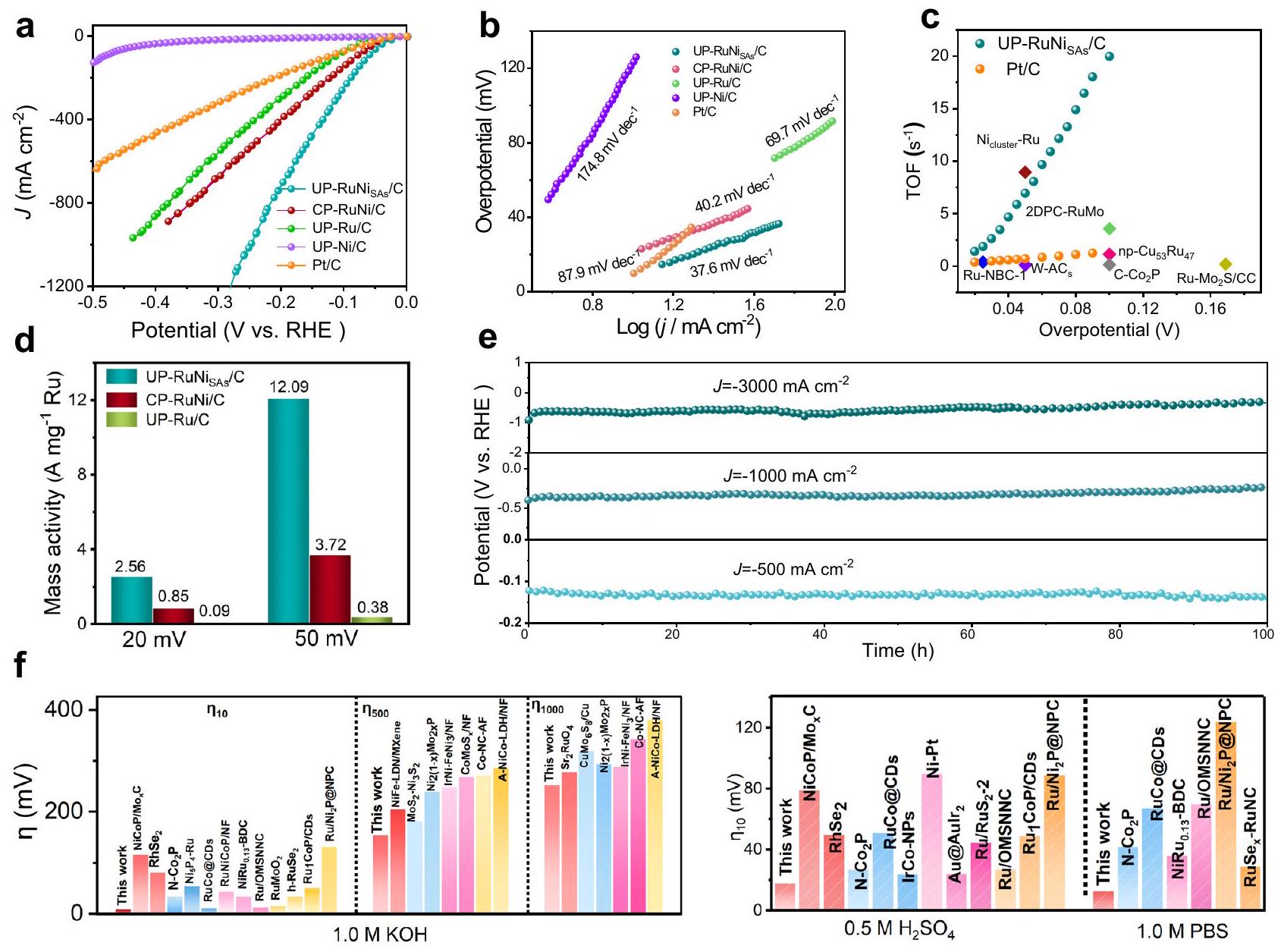 Fig. 5 | Electrochemical performances. a, Polarization curves and Tafel plots of the UP-Ni/C, UP-Ru/C, CP-RuNi/C, UP-RuNi and commercial Pt/C catalysts in TOF values of UP-RuNi compared with and previously reported catalysts in Activity of Ru mass normalization of the UP-Ru/C, CP-RuNi/C, UP-RuNi catalysts at and in 1 M KOH . e Long term stability testing of the UP-RuNis catalysts in Comparison in terms of