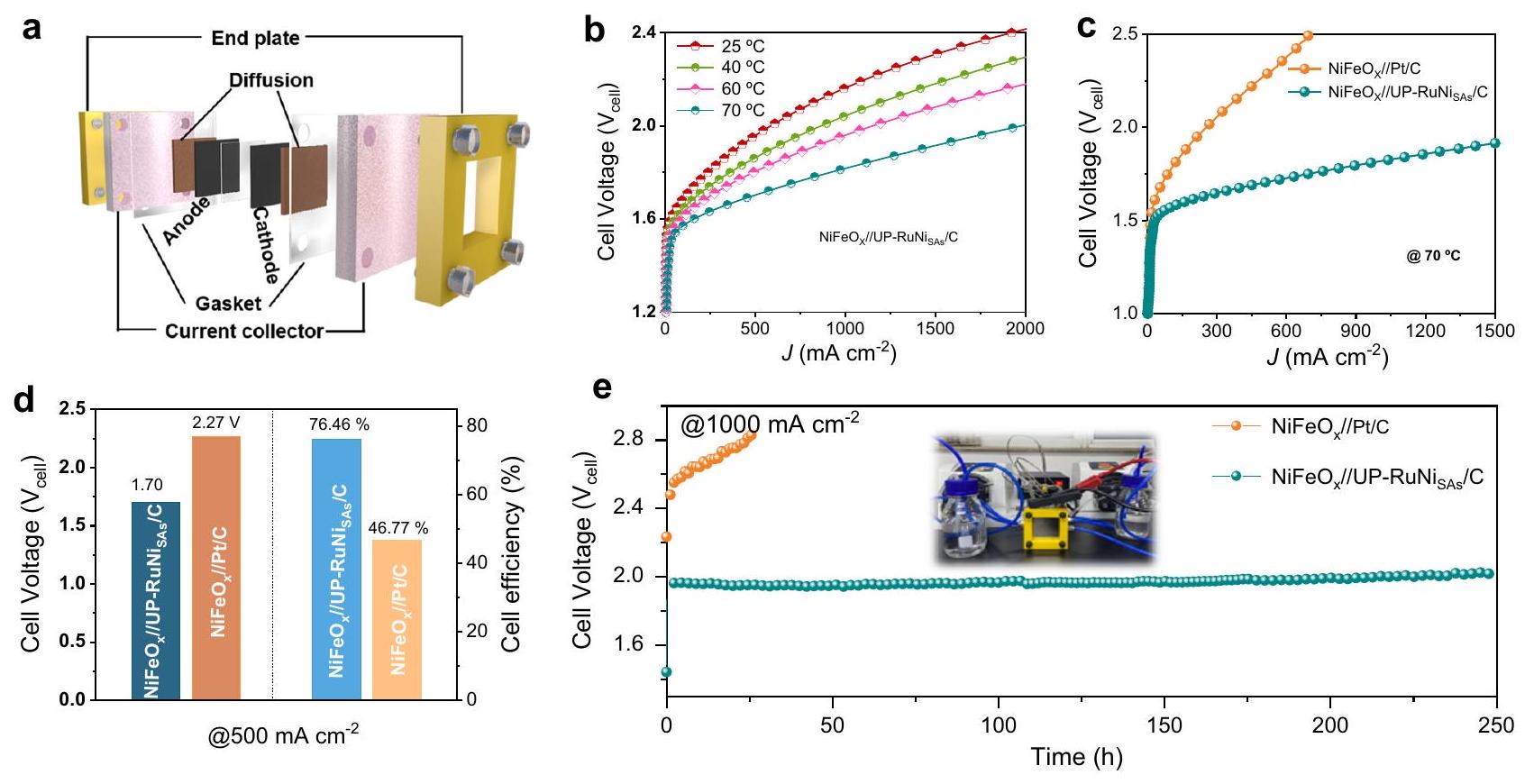 لتحقيق في آفاق تطبيق UP-RuNiكمادة كاثود تحت ظروف صناعية فعلية، قمنا بإنشاء خلية إلكتروليتية تعتمد على غشاء تبادل الأنيونات. استخدمنا المنتج التجاريالمحفز كأنود وقارنت أداء UP-RuNiمع و المحفزات بشكل منفصل عند الكاثود تجارياًتم بناء خلية التحليل الكهربائي AEM في تكوين ساندويتش بمساحةيتكون من جامع تيار، محفز كاثود (أنود)، وغشاء أنيوني بدون ضغط حراري، كما هو موضح في الشكل 6a. كما توقعنا، فإن أداء إلكتروليزر AEM القائم على UP-RuNiتم تحسين المحفز ككاثود مع ارتفاع درجة الحرارة (الشكل 6ب). ومن المدهش أنه تم تسجيل جهد خلية منخفض قدره 1.70 فولت و 1.95 فولت عند و على التوالي فيلـ UP-RuNisالعامل المساعد، في حين أنوتم الحصول على جهد الخلية 1.91 فولت و 2.27 فولت على التوالي باستخدام Pt/C والعوامل الحفازة في (الشكل 6c والشكل التكميلية 57). والأهم من ذلك، كفاءات تحويل الطاقة لـ