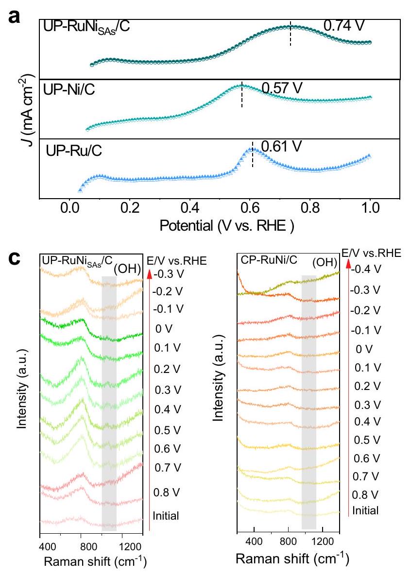 كما ذُكر أعلاه، فإن ميل Tafel المنخفض يؤكد أن الخطوة المحددة للسرعة في التفاعل هي إزالة OH الوسيطة. للحصول على فهم أعمق لآلية التفاعل لـ UP-RuNi تجاه HER القلوية ولرصد سلوك الامتصاص (الإزالة) المحدد لـ OH الوسيطة، أجرينا تجربة إزالة CO وقياس رامان أثناء التشغيل. يتم تحفيز الأكسدة الكهروكيميائية لـ CO بواسطة امتصاص OH النشط، وبالتالي يُعتبر الانزياح السلبي لجهد الأكسدة مؤشرًا على وجود ألفة أقوى لـ OH للمحفز . كما هو موضح في الشكل 7أ، أظهرت UP-RuNis أقل سعة امتصاص لـ OH مع جهد ذروة يبلغ 0.74 فولت مقارنةً بـ UP-Ru/C النقي (0.61 فولت)، مما يعني أن OH