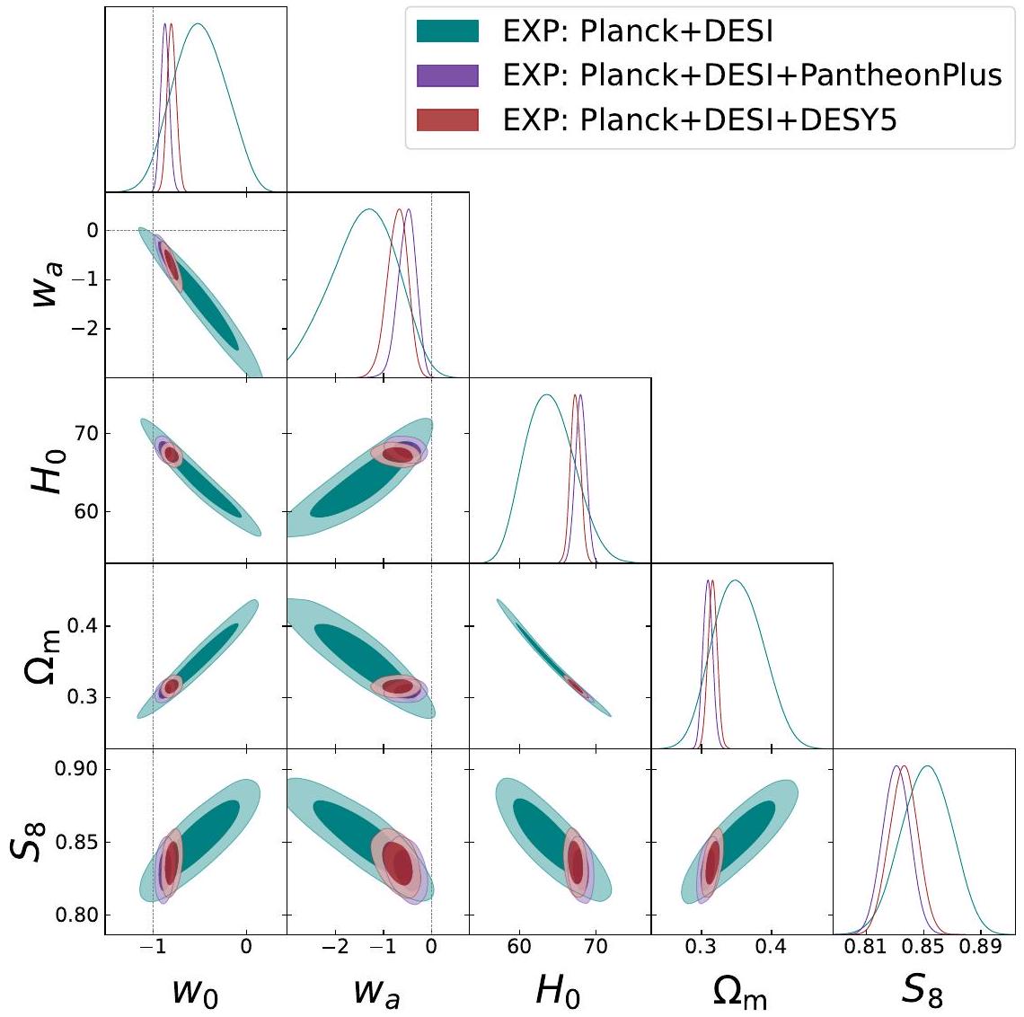 تظهر قياسات تذبذبات الصوت الباريونية (BAO) الأخيرة التي أصدرتها DESI، عند دمجها مع بيانات الخلفية الكونية الميكروية (CMB) من بلانك وعينتين مختلفتين من المستعرات العظمى من النوع Ia (بانثيون-بلس و DESY5) تفضيلًا للطاقة المظلمة الديناميكية (DDE) التي تتميز بمعادلة حالة شبيهة بالكيان الحاضر التي عبرت إلى نظام الشبح في الماضي. فرضية أساسية لهذه النتيجة هي افتراض معلمة خطية لتشيفالييه-بولارسكي-ليندر (CPL)