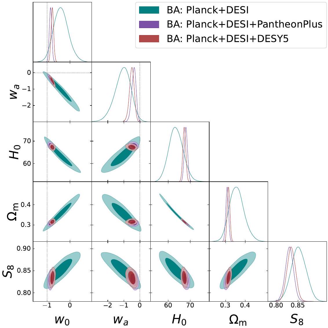 في الملاءمة للبيانات التي تمتد عبر ، والتي تغطيها ملاحظات BAO وSN، مما يؤدي إلى الاختلافات في في الملاءمة التي تم مناقشتها في المخطوطة. - BA: وأخيراً وليس آخراً، يتم تقديم تطور
