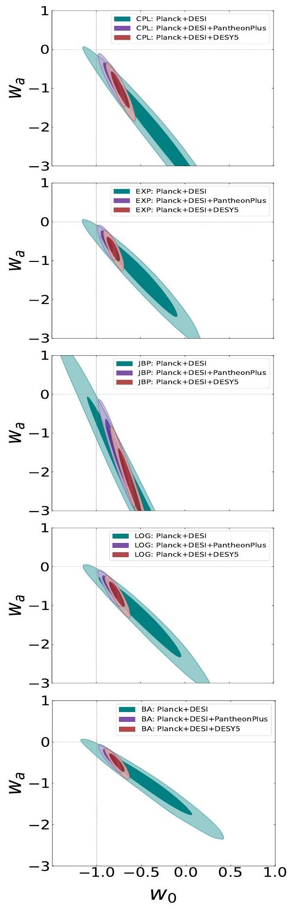 over CDM (which is quite similar for both scenarios). The agreement in predictions is further supported by Tab. 7. The only noticeable difference between the models is a slightly smaller pivot redshift in the exponential parameterization. However, the EoS at this pivot is constrained with comparable precision. Additionally, the predictions regarding the redshift of the phantom crossing agree within one standard deviation for both Planck + DESI + PantheonPlus and Planck + DESI + DESY 5 . - JBP: Among the five models analyzed, the JBP parameterization presents a more nuanced phenomenology regarding the evolution of the DE EoS. As shown in the third panels from the top in Fig. 7, due to its quadratic nature in the scale factor, the evolution of the EoS within the JBP parameterization crosses