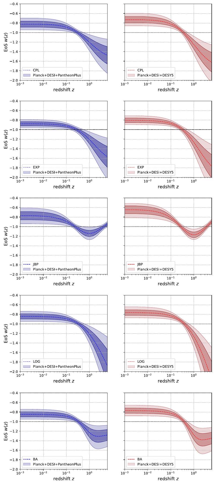 - Exponential: As seen when comparing the top panels with those in the second row from the top in Fig. 7, from a phenomenological perspective, the exponential parameterization closely resembles the CPL model. This similarity was already highlighted in the main text when comparing the improvement in
