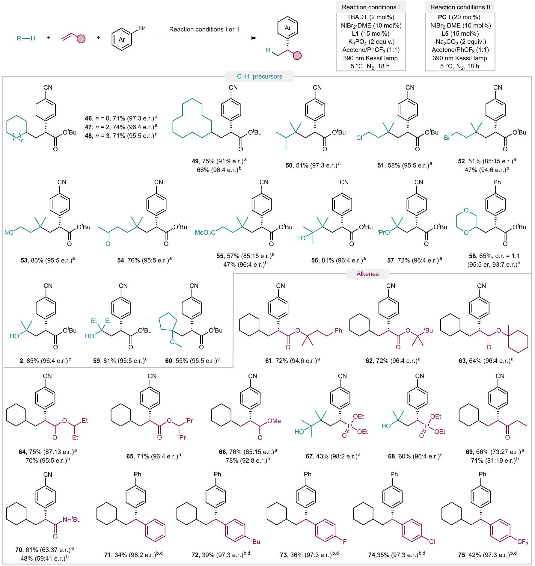 acceptors, although the products ( 69 and 70) were obtained with moderate enantioselectivity. Tertiary acrylamides furnished a trace amount of the desired dicarbofunctionalization adducts (Supplementary Table 9). Vinylarenes, a class of activated olefins that was not compatible in previous reports