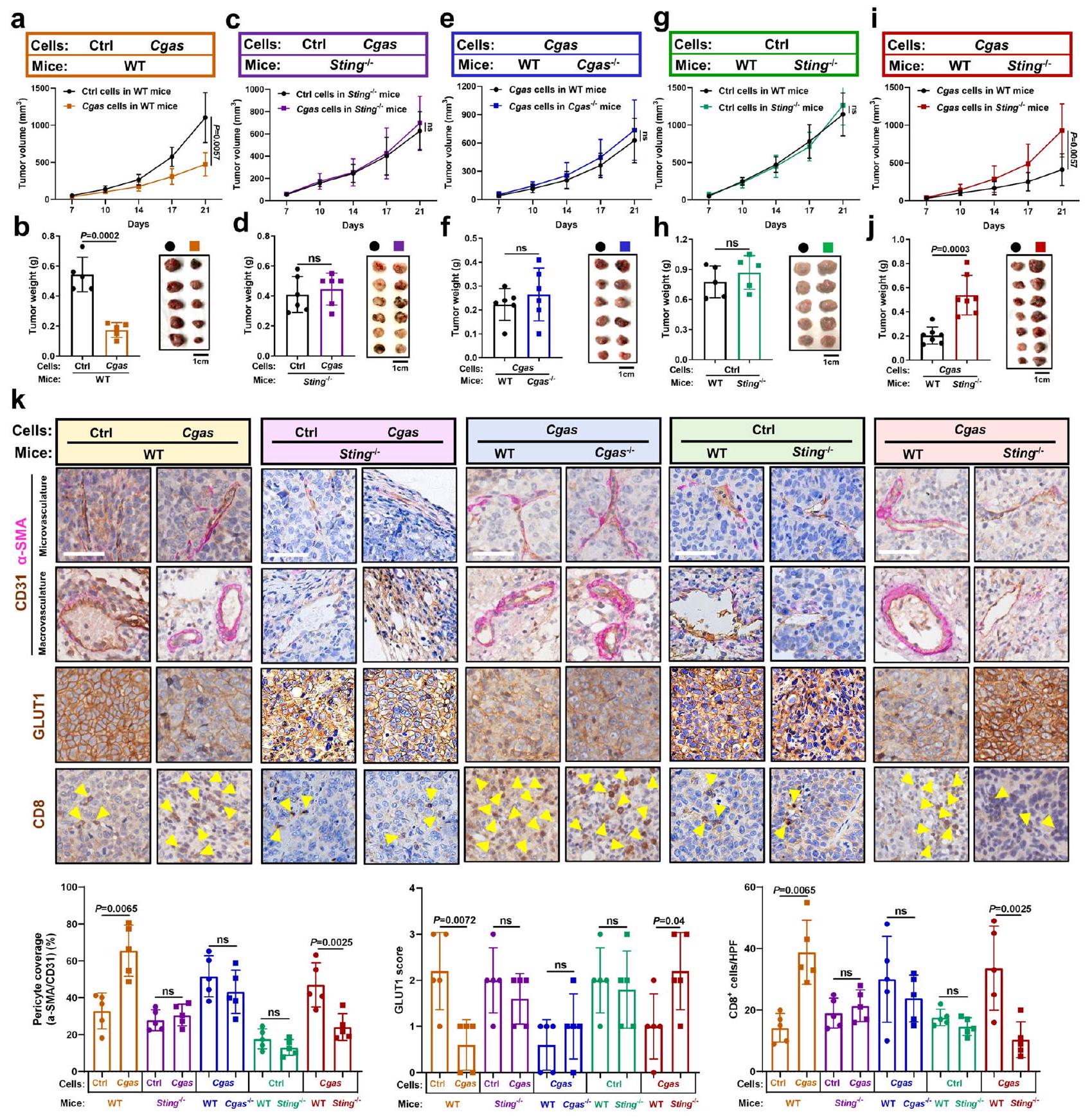 لاختبار ما إذا كان STING المضيف يعتمد على cGAS الورمي لتنظيم تطبيع الأوعية الدموية والاستجابة المناعية المضادة للأورام، قمنا بتحدي فئران Sting-/- وفئران WT بخلايا ذات cGAS كفء أو خلايا تحكم، على التوالي. طورت خلايا التحكم أعباء أورام مماثلة في فئران Sting-/- مقابل فئران WT (الشكل 2g، h)، في حين أظهرت الخلايا ذات cGAS الكفء نموًا أسرع في فئران Sting-/- مقابل فئران WT (الشكل 2i، j). على عكس الأورام المشتقة من خلايا التحكم، لوحظ انخفاض ملحوظ في