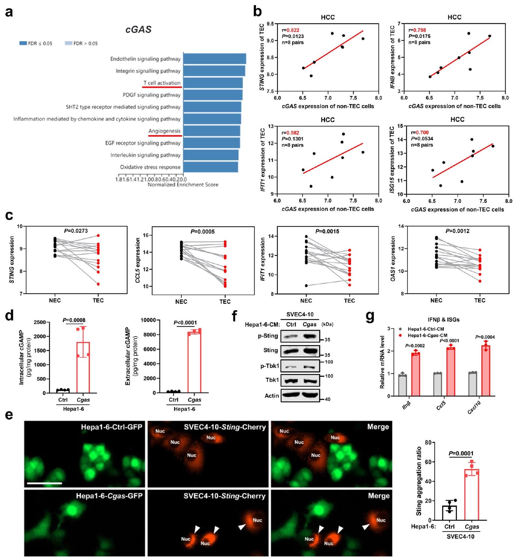كشف تحليل إثراء مجموعة الجينات (GSEA) (تحليل مسار بانثر) أن cGAS الورمي مرتبط بشكل كبير بكل من تنشيط الخلايا التائية وتكوين الأوعية الدموية في سرطان الكبد من TCGA (الشكل 3أ)، مما يشير إلى الدور التنظيمي لـ cGAS الورمي في إعادة تشكيل الأوعية الدموية. قمنا بمزيد من التقييم للعلاقة بين cGAS الورمي وتنشيط STING البطاني في سرطان الكبد البشري. CD31تم فرز الخلايا البطانية المرتبطة بالأورام (TECs) والخلايا غير المرتبطة بالـ TEC (خاصة خلايا النسيج الورمي) من أنسجة سرطان الكبد لنفس المريض. ومن المهم أن تعبير cGAS في الخلايا غير المرتبطة بالـ TEC كان مرتبطًا إيجابيًا بتعبير STING وجينات الاستجابة للإنترفيرون (ISGs) في خلايا TEC المقابلة (الشكل 3ب). علاوة على ذلك، مقارنةً بخلايا TEC المطابقة، كان CD31…عبّرت الخلايا البطانية الطبيعية (NECs) عن زيادة في STING وجينات الاستجابة للإنترفيرون (ISGs) (الشكل 3ج)، مما يؤكد دور STING البطاني في تطبيع الأوعية الدموية. بعد ذلك، تحققنا من تنشيط STING البطاني بواسطة cGAS في خلايا سرطان الكبد من خلال تجارب مخبرية. بعد التأكد من أن زيادة تعبير Cgas عززت إفراز cGAMP في خلايا سرطان الكبد عن طريق قياس مستويات cGAMP في الوسط داخل الخلايا وخارجها (الشكل 3د)، اختبرنا بعد ذلك ما إذا كان cGAMP المنتج بواسطة خلايا سرطان الكبد يمكن أن ينشط STING في الخلايا البطانية المحيطة، باستخدام تكوين تجمعات STING حول النواة كمؤشر على تنشيط STING بواسطة cGAMP.تم تأكيد تكوين تجمعات Sting عند تحفيزها بـ cGAMP لأول مرة في الخلايا البطانية التي تعبر عن بلازميد StingCherry بعد استنفاد Sting الداخلي (الشكل التكميلي 6a، b). ثم، تم تعايش الخلايا البطانية المعبرة عن Sting-Cherry مع خلايا Cgas الموسومة بـ GFP وخلايا Ctrl الموسومة بـ GFP على التوالي. وجدنا أن تجمعات Sting كانت أكثر وضوحًا بكثير في الخلايا البطانية المتعايشة مع خلايا Cgas مقارنة بخلايا Ctrl (الشكل 3e). بالإضافة إلى ذلك، مقارنةً بالوسط المشروط (CM) المشتق من خلايا Ctrl، أدى تحفيز الخلايا البطانية بواسطة الوسط المشروط المشتق من خلايا Cgas (تم تأكيد وجود كمية أكبر بكثير من cGAMP في الوسط من خلايا Cgas مقارنة بخلايا Ctrl في الشكل 3d) إلى تنشيط Sting، كما يتضح من زيادة فسفرة Sting وTbk1، بالإضافة إلى زيادة Ifn.وتعبيرات جينات الاستجابة للإنترفيرون (الشكل 3f، g).