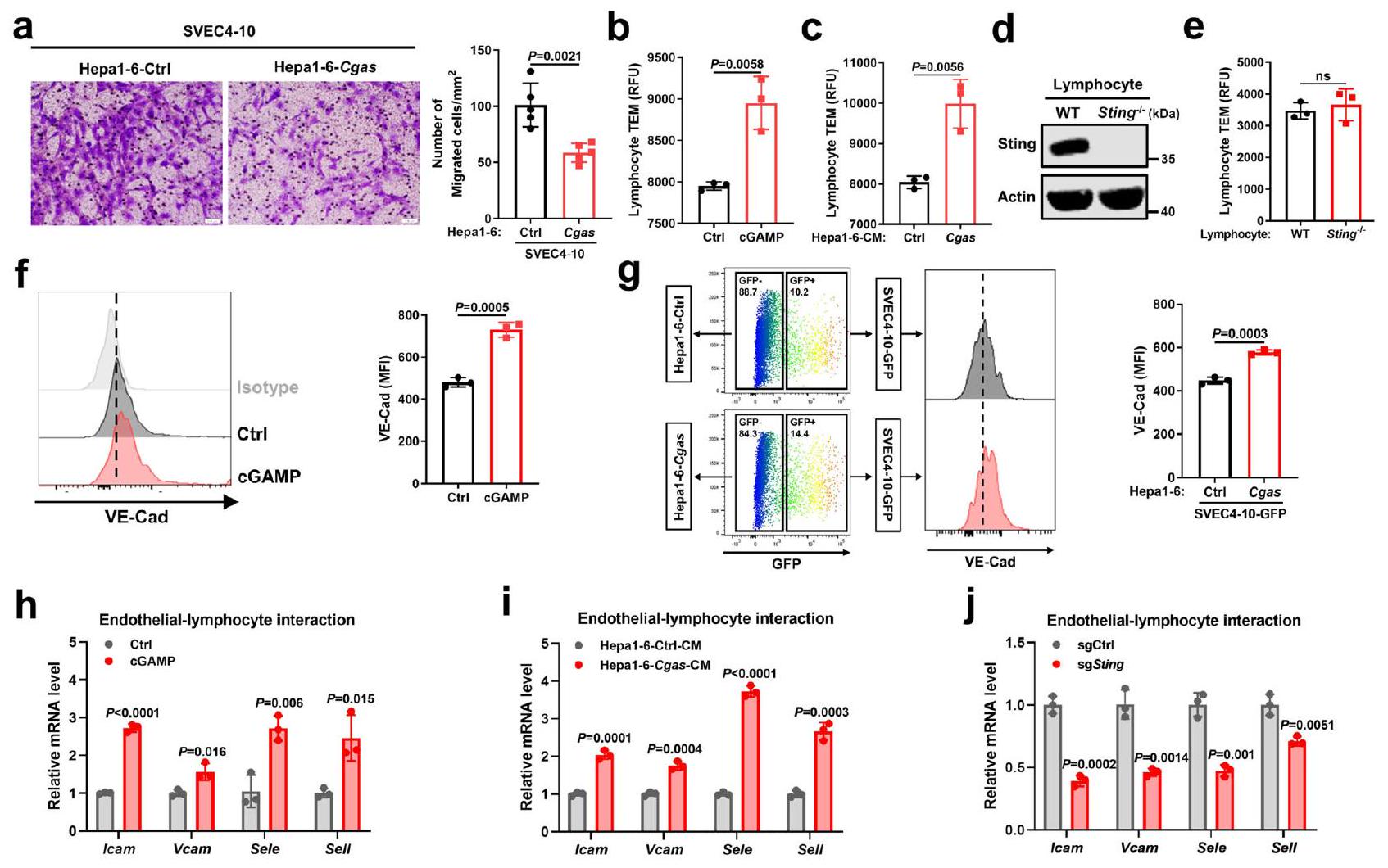 من الناحية الميكانيكية، أظهرت خلايا البطانية زيادة في تعبير الكادهرين البطاني الوعائي (VE-Cad) بعد علاجها بـ cGAMP (الشكل 4f) أو في الثقافة المختلطة مع خلايا Cgas مقارنة بخلايا Ctrl (الشكل 4g)، مما يشير إلى أن تنشيط STING في خلايا البطانية الناتج عن خلايا Cgas يحافظ على استقرار وصلات خلايا البطانية، والتي تعد ضرورية لحركة الكريات البيضاء.. بالإضافة إلى ذلك، بعد تنشيط Sting بواسطة cGAMP أو تحفيز CM المستمد من خلايا Cgas، أظهرت الخلايا البطانية زيادة في تعبير جزيئات الالتصاق المشاركة في التفاعل بين الخلايا البطانية واللمفاويات بما في ذلك Icam وVcam وE-selectin (Sele) وL-selectin (Sell) (الشكل 4h، i). في المقابل، أدى نقص Sting إلى إضعاف تعبير هذه الجزيئات الالتصاقية (الشكل 4j). علاوة على ذلك، فإن حجب IFNمسار الإشارة بواسطة مثبط تنشيط STAT1 فلودارابين (فلورا) عكس تعبير Ccl5 المحفز بواسطة cGAMP، ولكن ليس تعبير Icam (الشكل التكميلي 6i)، وIFNالعلاج زاد من تعبير Ccl 5، لكنه لم يؤثر بشكل واضح على تعبير Icam في الخلايا البطانية (الشكل التكميلي 6j)، مما يشير إلى أن تنظيم جزيئات الالتصاق المرتبطة بتفاعل الخلايا البطانية مع اللمفاويات يتم بشكل رئيسي عبر مسار STING، بدلاً من جيناته المستهدفة IFN.وISGs. تشير هذه البيانات مجتمعة إلى أن cGAS في الورم ينتج cGAMP لتنشيط مسار STING في الخلايا البطانية، مما يثبط تكوين الأوعية الدموية ويعزز حركة اللمفاويات من خلال الحفاظ على استقرار وصلات الخلايا البطانية وزيادة التعبير عن جزيئات الالتصاق المرتبطة بتفاعل الخلايا البطانية مع اللمفاويات.