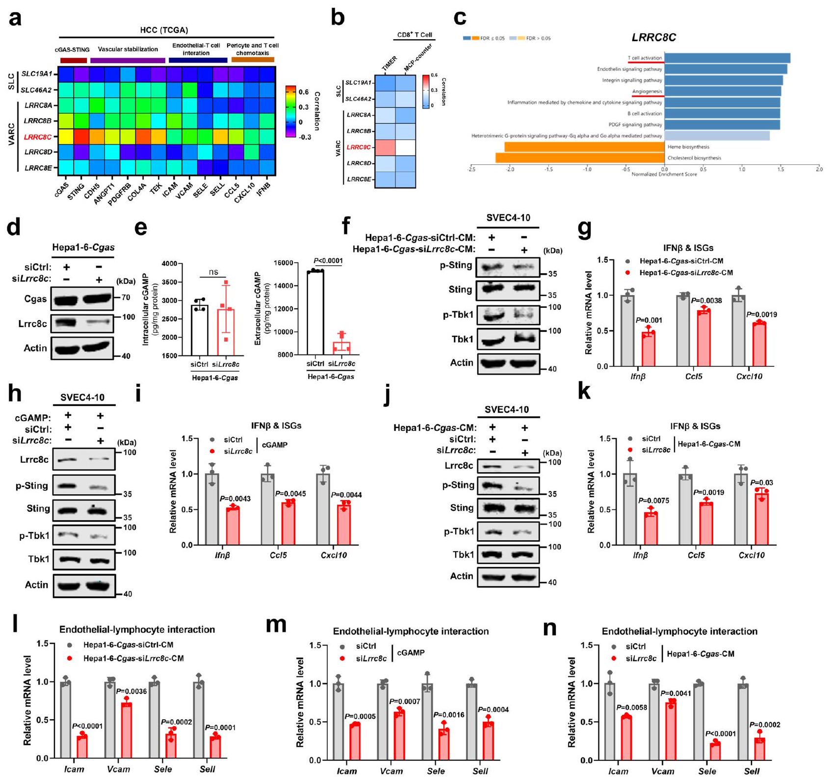 التعبيرات (الشكل 5f، g)، مما يشير معًا إلى أن cGAMP الذي تنتجه خلايا سرطان الكبد يُفرز خارج الخلية عبر قنوات LRRC8C، وبالتالي يُفعّل STING في الخلايا البطانية. نظرًا لأن قنوات LRRC8 ثبت أنها ناقل ثنائي الاتجاه لـ cGAMP، قمنا بعد ذلك بتحديد ما إذا كان cGAMP الذي تفرزه خلايا السرطان يدخل خلايا البطانة أيضًا عبر LRRC8C. عندما تم حجب تعبير Lrrc8c في خلايا البطانة، فشل كل من cGAMP (الشكل 5h، i) أو الوسط المستخلص من خلايا Cgas (الشكل 5j، k) في تنشيط مسار Sting في خلايا البطانة، كما يتضح من انخفاض فسفرة Sting وTbk1، بالإضافة إلى انخفاض Ifnوتعبيرات ISGs، مما يشير إلى أن خلايا البطانية تستخدم قنوات LRRC8C لاستيراد cGAMP، مماثلة للتقارير السابقة. علاوة على ذلك، أدى تثبيط Lrrc8c في خلايا Cgas أو الخلايا البطانية إلى كبح كبير في تعبير جزيئات الالتصاق المرتبطة بتفاعل الخلايا البطانية مع اللمفاويات الناتج عن cGAMP أو الوسط المستمد من خلايا Cgas في الخلايا البطانية (الشكل 51-ن). تشير هذه البيانات مجتمعة إلى أن قنوات LRRC8C تتوسط نقل cGAMP من خلايا سرطان الكبد إلى الخلايا البطانية الوعائية، مما يؤدي إلى تنشيط مسار STING في الخلايا البطانية.