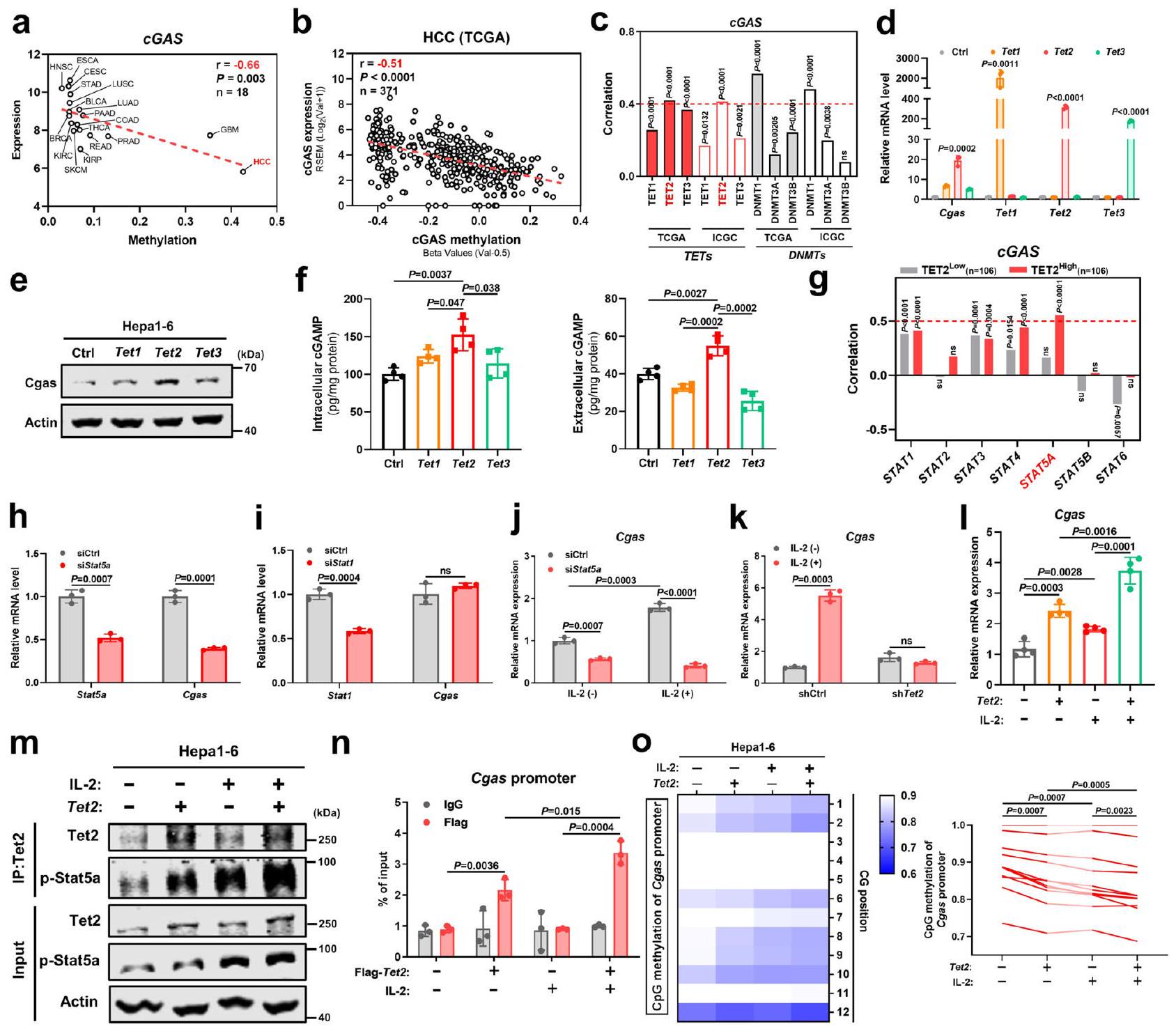 We further verified the regulation of tumor cGAS by TET2 and STAT5A signaling in human liver cancer samples and found that high tumor TET2 and p-STAT5A expressions were associated with high tumor cGAS expression (Fig. 8i, j). In TCGA database, tumor TET2, STAT5A, and cGAS expressions positively correlated with vascular
