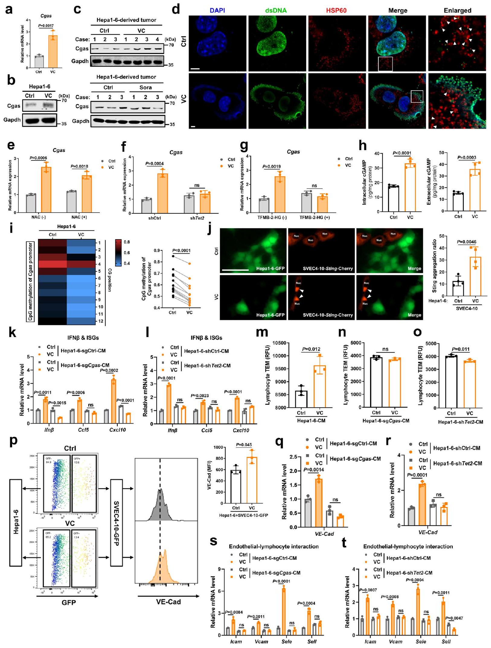 To next assessed whether VC-induced tumoral cGAS activates endothelial STING and enhances lymphocyte trafficking, an obvious increase in cGAMP production and secretion in liver cancer cells after VC treatment was firstly confirmed (Fig. 7h). VC treatment resulted in much more marked formation of perinuclear Sting aggregates, which are readout for STING activation by cGAMP , in Sting-Cherryexpressed endothelial cells when co-cultured with GFP-labeled Hepa16 cells (Fig. 7j), whereas VC treatment on endothelial cells alone neither induced more Sting aggregates nor upregulated Cgas expression (Supplementary Fig. 10a-c), implying that VC indirectly activates endothelial Sting through cancer cells. Similarly, CM derived from VCtreated Hepal-6 cells significantly activated endothelial Sting, as evidenced by elevated phosphorylation of Sting and Tbk1, as well as increased Ifn and ISGs expressions (Supplementary Fig. 9c, d), whereas VC treatment on endothelial cells alone led to no obvious difference in endothelial Sting activation (Supplementary Fig. 10d, e). Importantly, when the Cgas or Tet2 expression was blocked (Supplementary Fig. 9e), these cells-derived CM after VC stimulation failed to activate endothelial STING (Supplementary Fig. 9f, g and Fig. 7k, l). Furthermore, we identified that more lymphocytes transmigrated through endothelial cell barriers stimulated by CM from VC-treated Hepal-6 cells versus PBS-treated cells (Fig. 7m). After exposure to CM from VC-treated Hepa1-6 cells with Cgas or Tet2 deficiency, endothelial cell barriers did not promote transendothelial migration of lymphocytes (Fig. 7n, o). Therefore, these results suggest that VC-induced TET2 upregulates tumor cGAS to activate STING pathway in endothelial cells and promote lymphocyte trafficking.