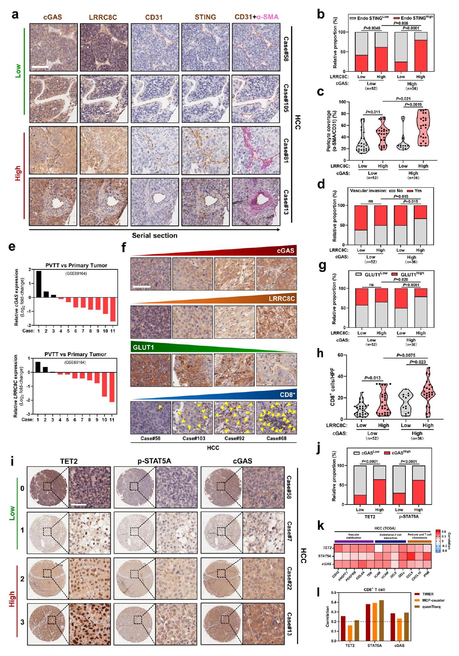 بعد ذلك، قمنا بدراسة مستويات تعبير البروتين لمحور الورم TET2-p-STAT5A-cGAS-LRRC8C-البطانة STING في خزعات الأورام من مرضى سرطان الكبد. في مقاطع متسلسلة من عينات سرطان الكبد من نفس المريض، كان التعبير العالي لـ LRRC8C في الورم مرتبطًا بالتعبير العالي لـ STING في CD31الخلايا البطانية الوعائية في مجموعة تعبير cGAS الورمي العالي أو المنخفض (الشكل 8أ، ب). من المهم، عندما كان تعبير LRRC8C الورمي مرتفعًا، كان تعبير STING البطاني بشكل ملحوظ أعلى في مجموعة تعبير cGAS الورمي العالي مقارنة بمجموعة تعبير cGAS الورمي المنخفض (الشكل 8أ، ب)، مما يشير إلى أن تعبير cGAS الورمي يرتبط بتنشيط STING البطاني اعتمادًا على LRRC8C.