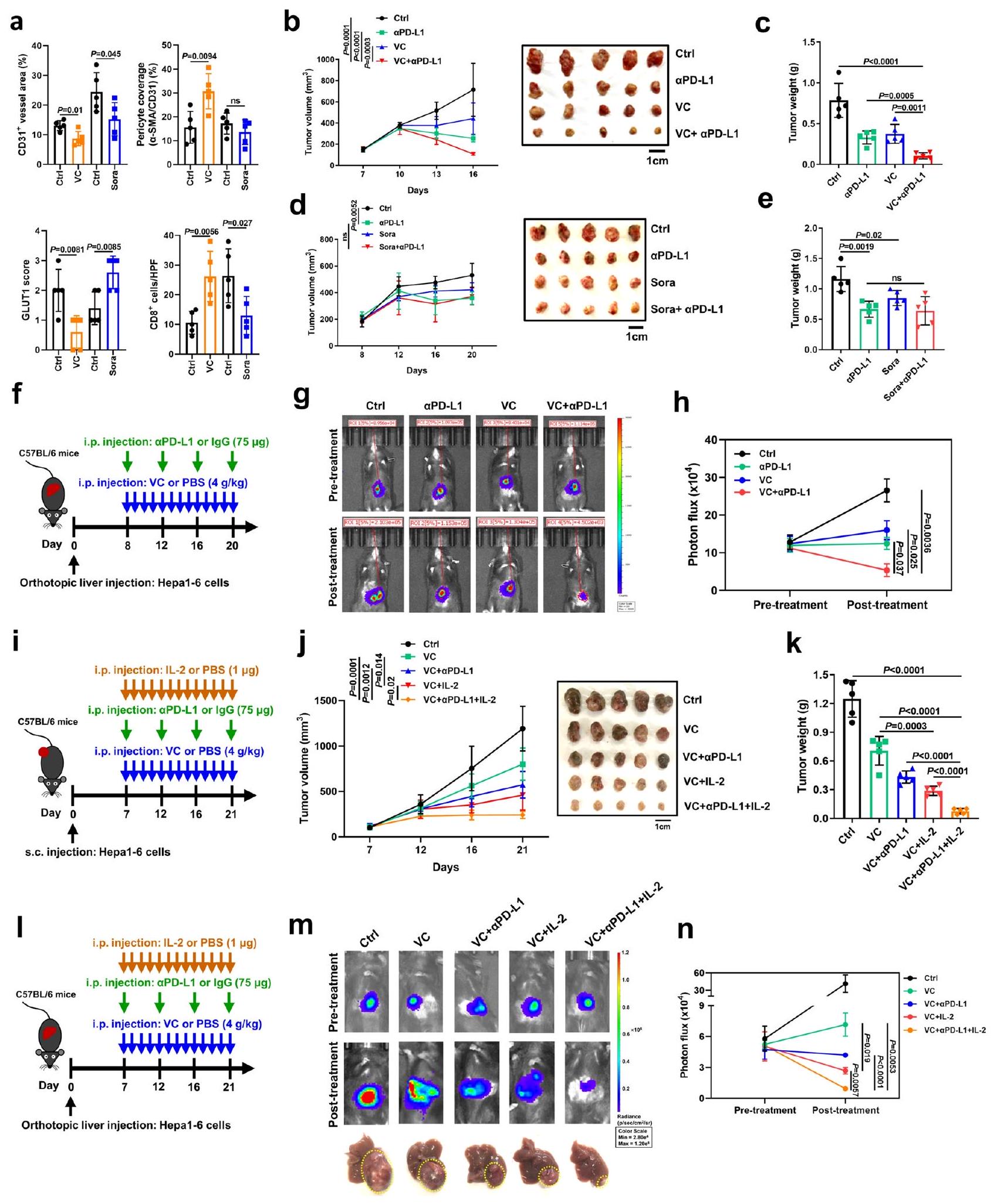 in situ with Hepal-6 cells with pre- and post-treatment of PD-L1 and VC either alone or in combination ( mice per group). Scheme representing the experimental procedure (i), tumor growth curves (j), and tumor burdens (k) of C57BL/6 mice injected subcutaneously with Hepal-6 cells with treatment of VC alone or combined with PD-L1, IL-2, or PD-L1 + IL-2 ( mice per group). Scheme representing the experimental procedure (I), representative luciferase-based bioluminescence images ( ) and quantification ( ) of C57BL/6 mice injected in situ with Hepal-6 cells with pre- and post-treatment of VC alone or combined with L1, IL-2, or PD-L1 + IL-2 ( mice per group). values are calculated using twotailed unpaired Student’s test (a), two-way ANOVA (b, d, j) and one-way ANOVA (c, e, h, k, n). ns not significant. Source data are provided as a Source Data file.