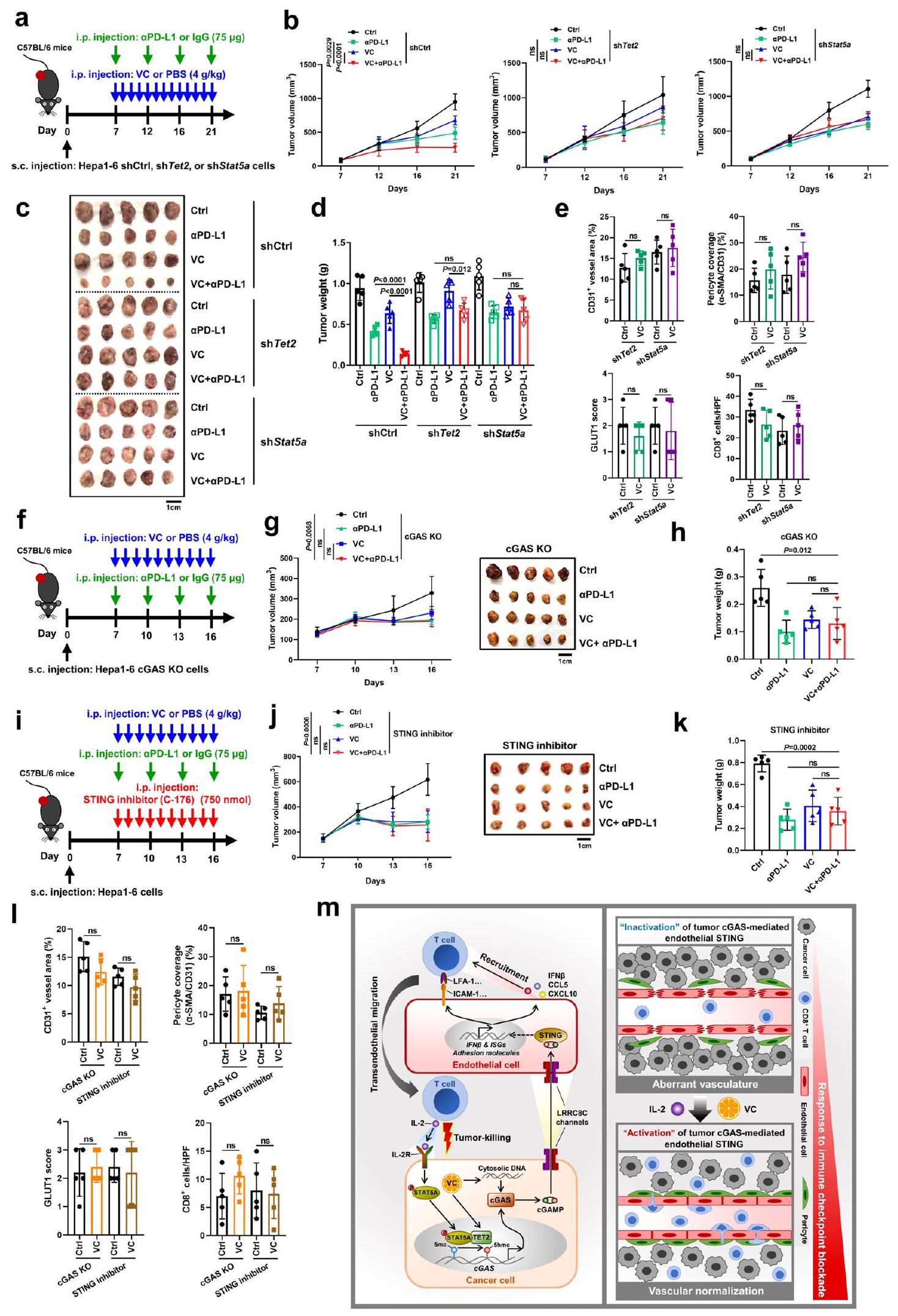 ( ) coverage of vessels ( ), GLUT1 hypoxic area, and cells infiltration in cGAS KO and STING inhibitor-treated tumors after VC treatment ( ). m Schematic illustration of TET2-mediated tumor cGAS triggering endothelial STING activation to regulate vasculature remodeling and anti-tumor immunity. Left: tumor cGAS produces cGAMP, which further transports via LRRC8C channels to activate STING in endothelial cells, enhancing recruitment and transendothelial migration of lymphocytes. In turn, intratumoral infiltrating lymphocytes secrete IL2 to activate tumor STAT5A signaling, which further synergizes with TET2 to epigenetically upregulate tumor cGAS, indicating a positive feedback loop. Right: stimulating tumor TET2 by VC to accelerate this positive feedback loop may effectively induce tumor vascular normalization and boost immunotherapy efficacy. values are calculated using two-way ANOVA (b, g, j), one-way ANOVA ( ), and two-tailed unpaired Student’s test ( ). ns, not significant. Source data are provided as a Source Data file.