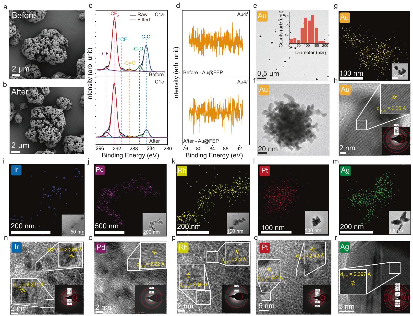 الشكل 2 | توصيف ما بعد التفاعل للمواد الحفازة والرواسب. صور SEM لجزيئات FEP (أ) قبل و (ب) بعد التفاعل. ج طيف C1s XPS لـ FEP قبل (أعلى) وبعد (أسفل) التفاعل.أوطيف XPS لـ FEP قبل (أعلى) وبعد (أسفل) التفاعل. الصورة الميكروسكوبية الإلكترونية، وتوزيع حجم الجسيمات لجسيمات الذهب النانوية. صورة TEM لجسيم الذهب النانوي الموزع في الماء. خريطة EDX للذهب؛ الصورة المرفقة هي صورة TEM للعينة التي تم تحليلها بواسطة EDX.قياس المسافة d على الذهب، يحتوي الإطار الصغير في الأسفل الأيمن على نمط SAED للجسيمات. رسم خرائط EDX لـ (i) Ir، (j) Pd، (k) Rh، (l) Pt، (m) Ag. قياس المسافة d على (n) Ir، (o) Pd، (p) Rh، (q) Pt، (r) Ag؛ تحتوي الإطارات الصغيرة على نمط SAED للجسيمات. يبدو أن جميع تلك الأيونات يمكن تقليلها بواسطة CEC، ولكن بمعدلات مختلفة. من الجدير بالذكر أنه لا يبدو أن هناك رابطًا بين الجهد الاختزالي وحركية التفاعل. نظرًا لأنيميل إلى التراكم على سطح البوليمرات المفلورة في الماء، وأخذًا في الاعتبار الدور المحتمل لـاستُحضِر في التجارب السابقة، قمنا بمقارنة النتائج التي تم الحصول عليها لجميع هذه المعادن في ظروف لاهوائية وهوائية. بعد ساعة واحدة، نلاحظ باستمرار أن كمية أيونات المعادن المخفضة أعلى في معظم الحالات تحت الظروف اللاهوائية. يتم ملاحظة اختلاف طفيف فقط في حالة، و أو .