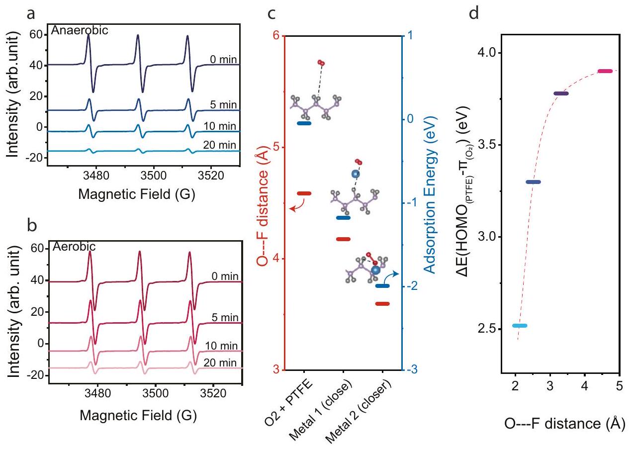 Fig. 3 | About the influence of oxygen. EPR signals acquired for 20 min , during the reduction of TEMPO (paramagnetic) to TEMPOH (non-paramagnetic) by ultrasonication of a TEMPO solution in presence of FEP in (a) anaerobic or (b) aerobic conditions. c Calculated distance between O of oxygen and F , and adsorption
