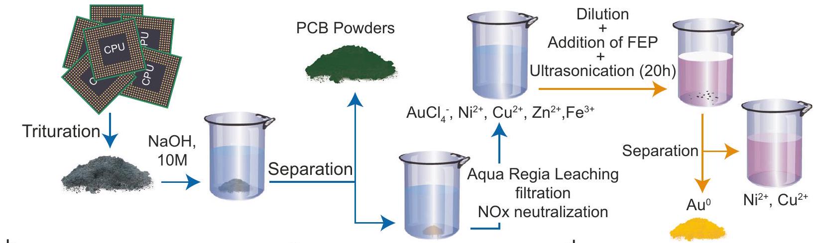 The CPUs are first crushed to a powder that is soaked in a 10 M NaOH solution for 48 hours to remove printed circuit board on the surface. After separation, the CPUs were rinsed and soaked in 500 ml aqua regia ( ) until all metal from the surface are dissolved in the solution. The concentration of gold in the solution reaches about at that stage. The solution is then filtered. Nitrous oxides are neutralized by evaporating the solution until no red colored gases are emanated from the solution, while HCl is dropwise added to the solution. The solution is diluted 10 times, with a pH remaining at . The pH is not adjusted further, and 10 mg of FEP powder is added to 50 mL of the as obtained solution. The reactor is then ultrasonicated in aerobic conditions.