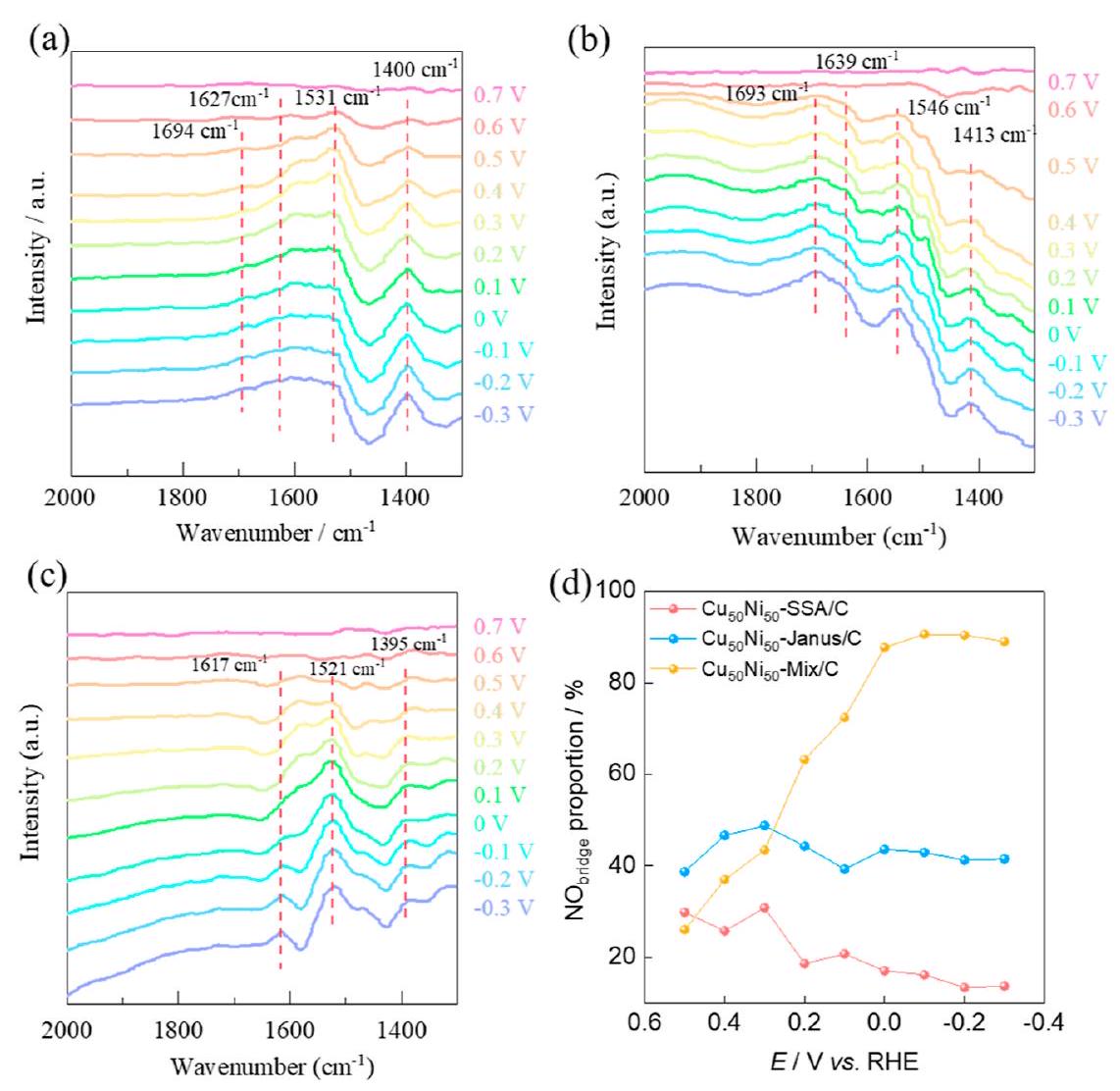 تم استخدام ATR-FTIR الكهروكيميائي في الموقع (الشكل 4 أ-د) لتحديد الأنواع في التفاعل. بالنسبة لجميع المحفزات، مع انخفاض الجهد من 0.7 فولت إلى -0.3 فولت، ظهر ذروة امتصاص حول