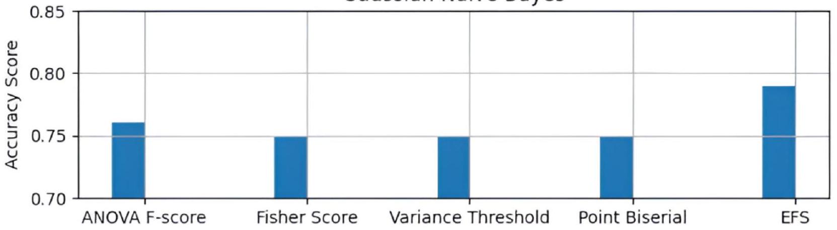 Figure 2 shows the plot for comparing accuracy scores of different feature selection techniques in the Gaussian Naive Bayes model. The plot shows that the proposed AdaptDiab approach performs better than other feature selection techniques.