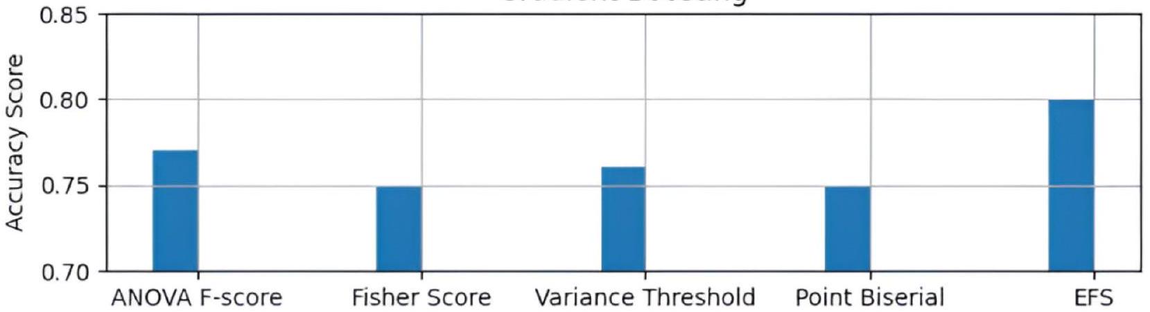 Figure 5 shows the plot for comparing the accuracy scores of different feature selection techniques in the Gradient Boosting model. The plot shows that the proposed AdaptDiab approach performs better than other feature selection techniques.