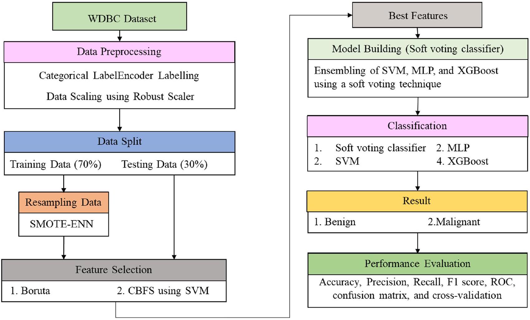 تقنية محسّنة تعتمد على التصويت الناعم في تعلم الآلة للكشف عن سرطان الثدي باستخدام اختيار ميزات فعّال وتوازن الفئات SMOTE-ENN An improved soft voting-based machine learning technique to detect breast cancer utilizing effective feature selection and SMOTE-ENN class balancing