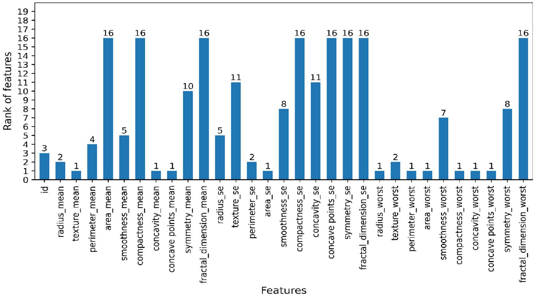In this study, when Boruta with XGBoost is employed for feature selection on WDBC, it assigns one rank (the highest rank) to ten features based on their significance for breast cancer categorization, as shown in Fig. 3. The z-scores of these features are -0.173822 for texture_mean, concavity_mean for for concave points_mean, -0.156225 for area_se, 0.296342 for radius_worst, 1.039188 for perimeter_worst, -0.156062 for area_worst, 0.191384 for compactness_worst, 0.223847 for concavity_worst and 0.091067 for concave points_worst.