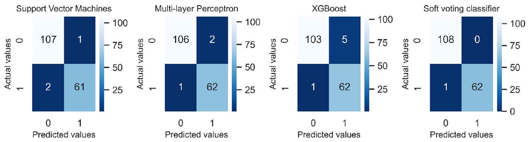 On the test dataset, Table 4 shows the accuracy, precision, recall, and F1 score of the soft voting classifier and its basic classifiers after training on all features. It reveals that the soft voting classifier and SVM obtained comparable performance and are ranked first, whereas MLP is ranked second, and XGBoost is the least efficient across all features. The recall score, however, stays the same across all classifiers, i.e., 96.83%.