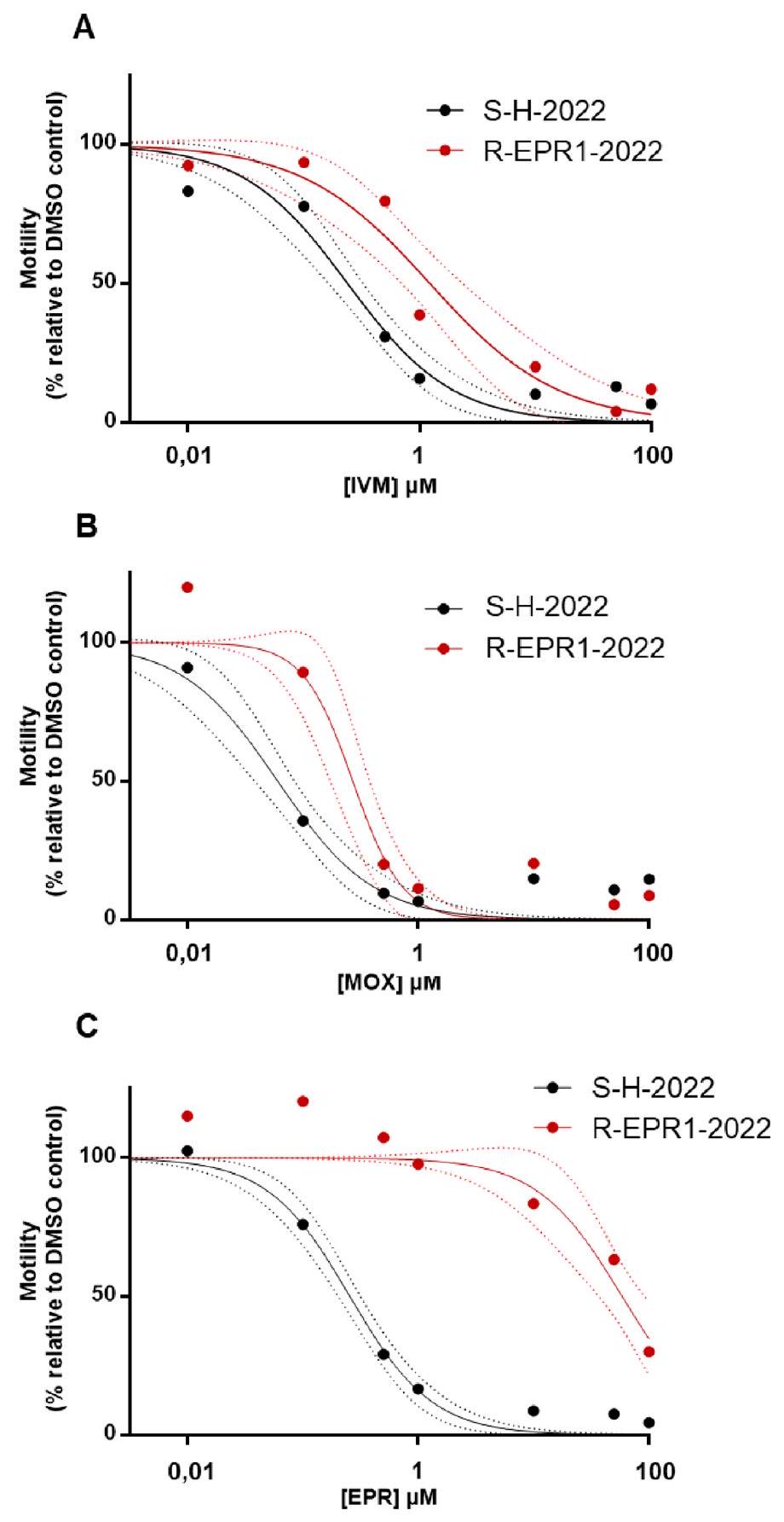 | Motility assay | IVM | MOX | EPR | IVM | MOX | EPR | IVM | MOX | EPR | References | ||