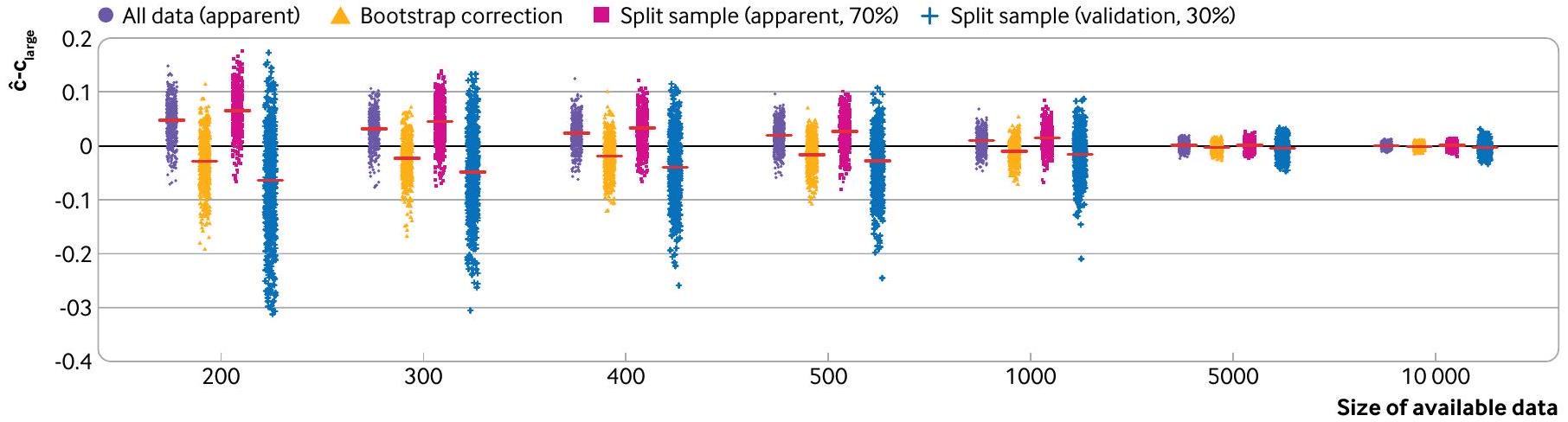bootstrapping, all available data are used to develop the model, and all available data are used to evaluate model performance. k -fold cross validation can be seen an extension of the split sample approach but with a reduction in the bias and variability in estimation of model performance (box 3).