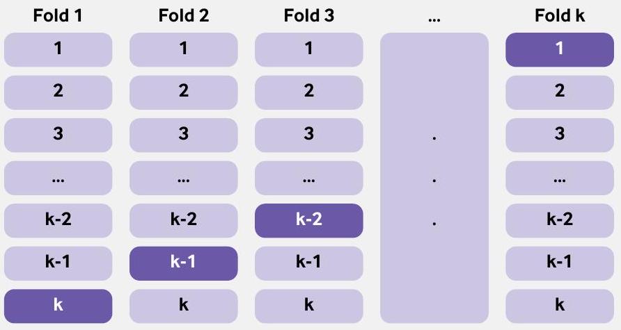 | التحقق المتقاطع باستخدام k-fold | يتم تقييم أداء النموذج من خلال تقسيم البيانات إلى k مجموعات، حيث
