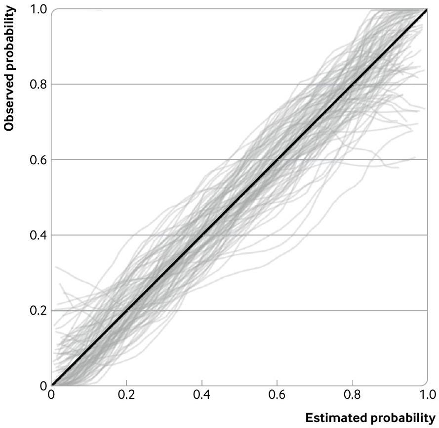 To illustrate this approach, figure 5 shows the empirical distribution of 100 calibration curves for our two applied examples when simulated using the sample size previously calculated to target a standard error of 0.0765 (confidence interval width of 0.3 ) for the calibration slope. For the pain intensity continuous outcome, 258 participants were identified as necessary for estimating calibration slope assuming it was 1, and the corresponding distribution of curves based on this sample size is reasonably narrow (fig 5A). At predicted values less than 80, the spread of observed curves corresponds to a difference in pain score of only about 5 to 10 . Only at the upper end is the variability more pronounced (differences up to about 20), for example, with curves spanning pain scores of 80 to 100 at a predicted score of 90 . If values in this range represent thresholds critical to clinical decision making, then larger sample sizes might be required. However, any value over 80 is likely to be always classed as very high,