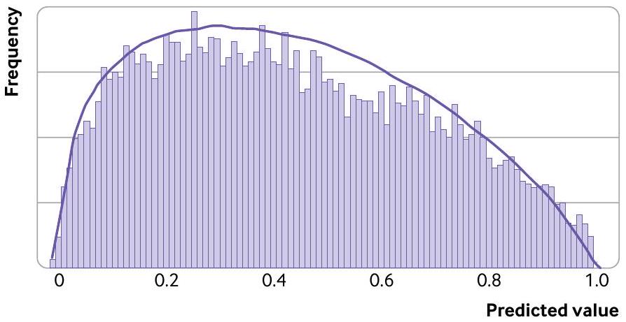 This task is perhaps the most difficult, and the distribution must give the same overall outcome event proportion as assumed above. The distribution of predicted values on the log odds scale (also known as the distribution of the linear predictor or the logit transformation of the probability values) is required, and a practical starting point is to assume the same distribution as reported in the model development study. In the model development study, histograms of event probabilities are occasionally provided as part of a calibration plot, and so could be approximated by a identifying a suitable distribution on the 0 to 1 scale (eg, a beta distribution is used in our applied covid-19 example later in this article), followed by conversion to the log odds scale. Sometimes the histograms are presented stratified by outcome status, and then these can be approximated, with samples taken from each while ensuring that the overall outcome event proportion is correct.