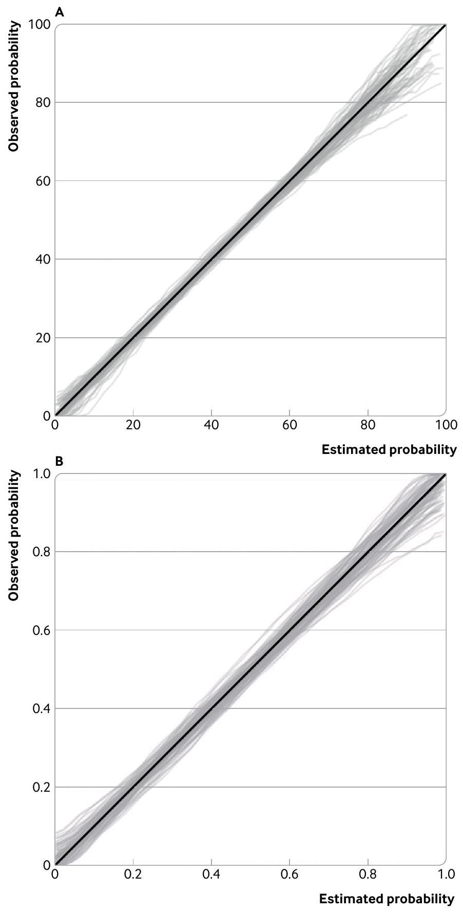 Fig 5 | Distribution of calibration curves for (A) pain intensity prediction model (based on 258 participants) and (B) covid-19 deterioration prediction model (based on 949 participants ( 408 events)), derived from 100 simulated datasets with the sample size required to estimate the calibration slope precisely according to a target confidence interval width of 0.3 (standard error ) for the calibration slope. Simulations assume that the models are well calibrated, with a true calibration slope of 1 and calibration-in-the-large of zero