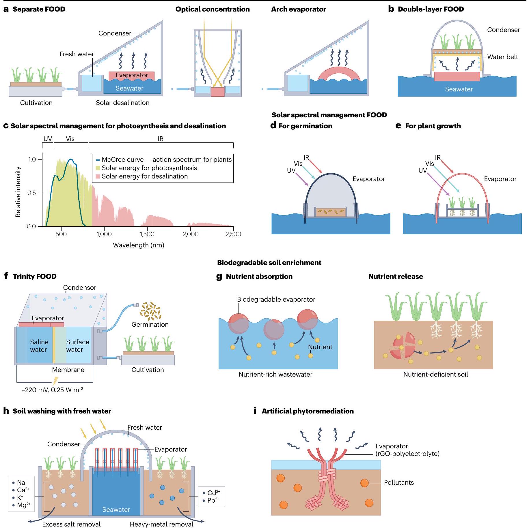 (Vis) للنمو النباتي (اللوحة هـ). و، أنظمة FOOD المتكاملة تقوم بتحلية المياه، وتوليد الطاقة وري المحاصيل. يتضمن النظام غرفة لتحلية المياه وتوليد الطاقة وغرفة زراعة. يتم استخراج طاقة تدرج الملوحة بين مياه البحر عالية الملوحة ومياه السطح بواسطة تقنية التحليل الكهربائي العكسي لإنتاج الكهرباء. ز، في معالجة التربة المدفوعة بالطاقة الشمسية، يتم نقل المياه العذبة الناتجة من خلال التبخر الشمسي السطحي مباشرة إلى التربة، حيث يمكن استخدامها في غسل التربة و/أو الري الزراعي. ح، تمتص المبخرات الشمسية القابلة للتحلل البيولوجي العناصر الغذائية من مياه الصرف الصحي وتُنقل إلى التربة، حيث تتحلل وتحرر العناصر الغذائية. ط، تستخدم التنظيف الاصطناعي للنباتات مبخرات مصممة مثل النباتات. تستخدم هذه المبخرات عملية التبخر السطحي الشمسي لتسريع تثبيت الملوثات في التربة أو الماء، مما يعزز عمليات المعالجة. IR، الأشعة تحت الحمراء؛ rGO، أكسيد الجرافين المخفض. الجزء و تم تعديله من المرجع 153، Springer Nature Limited. تم تعديل الجزء من المرجع 146، Elsevier.