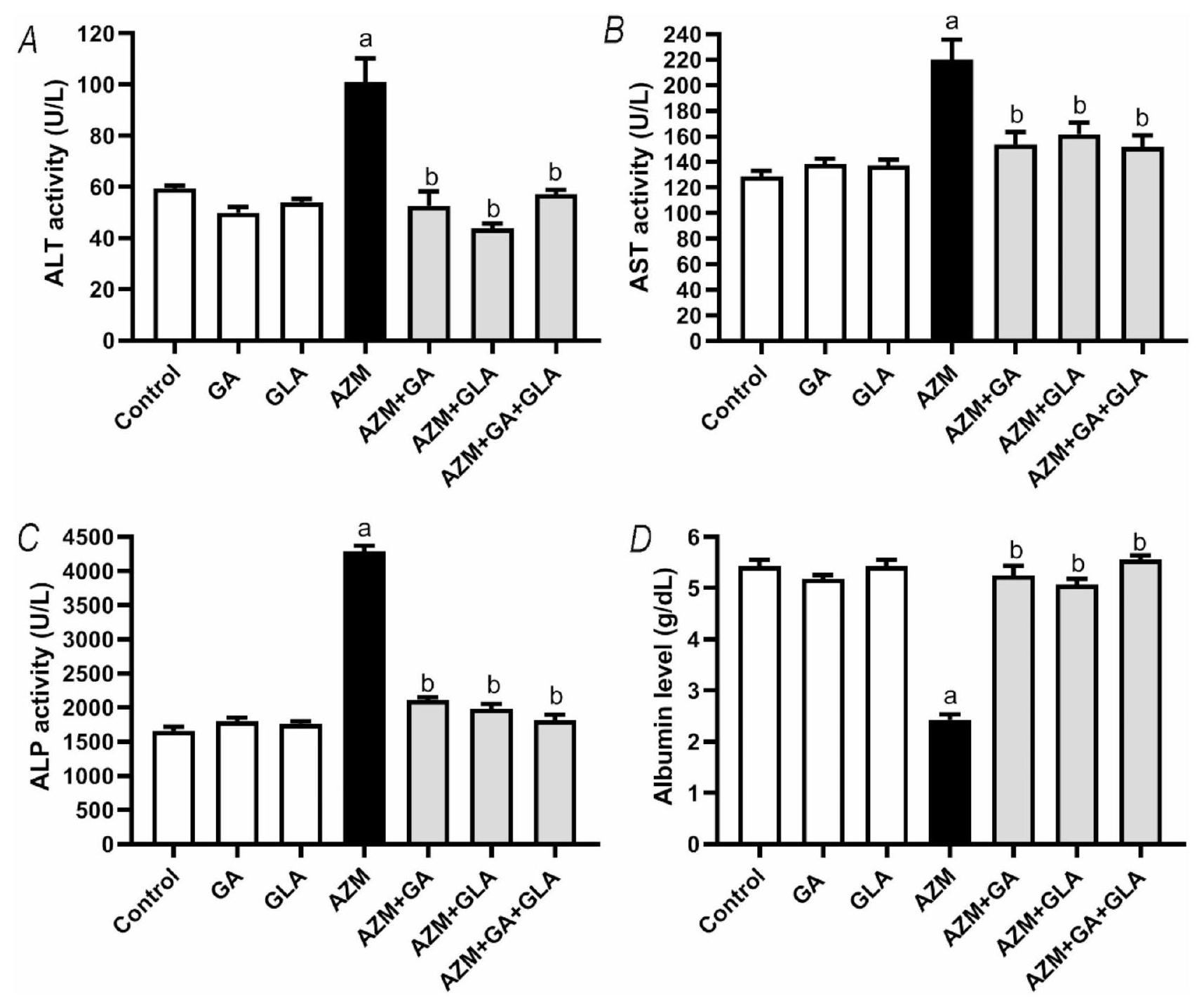Fig. 2. Effect of GA, GLA, and their combination on AZM-induced liver toxicity in rats. The markers include (A) serum ALT activity, (B) serum AST activity, (C) serum ALP activity, and (D) serum albumin level. The data is displayed as the mean SEM . We performed the ANOVA statistical analysis first, followed by Tukey’s post-hoc analysis. A indicates a significant difference from the control group, while b indicates a significant difference from the AZM group.