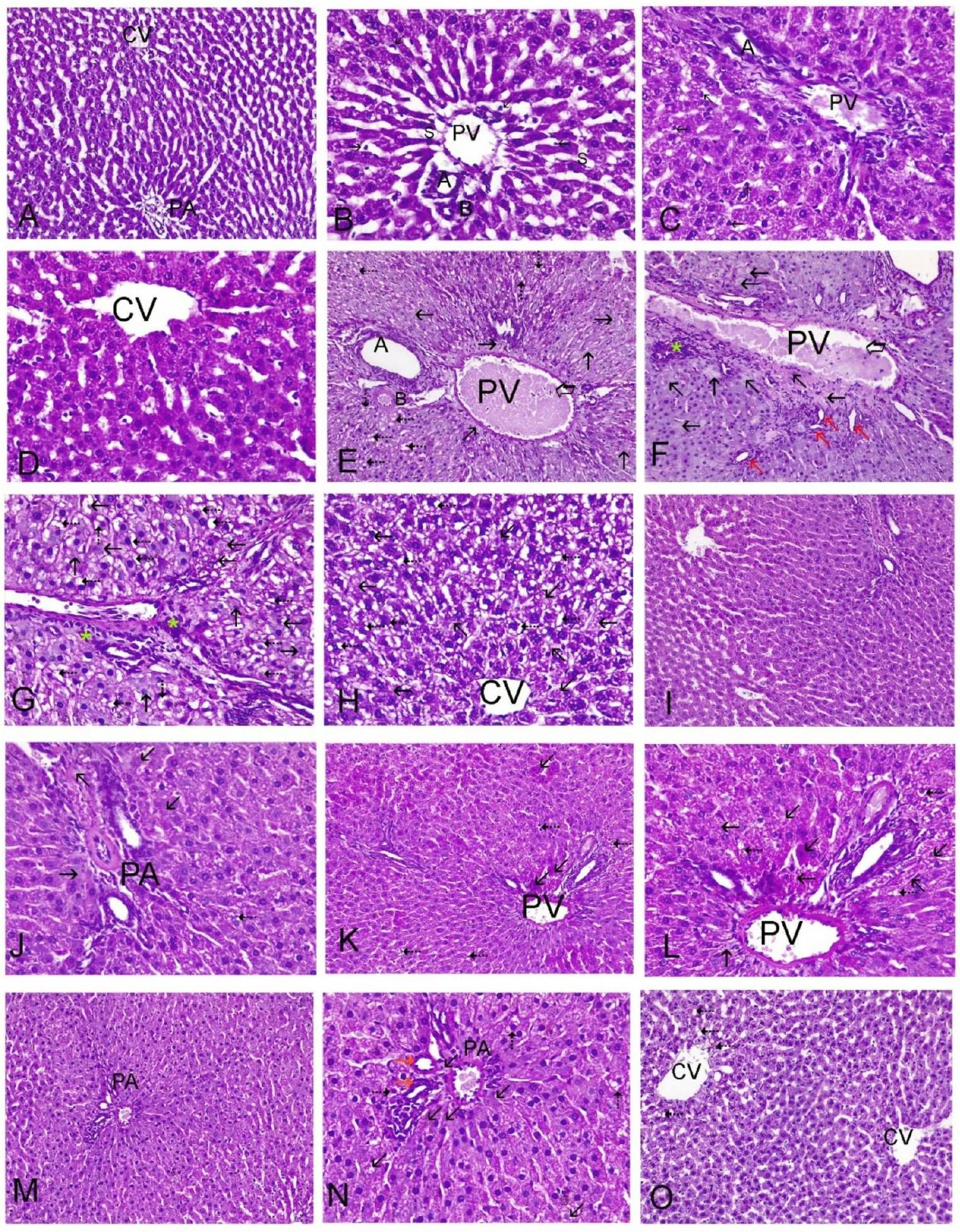 4Fig. 3. Histopathological investigations of liver sections stained with H&E. Control groups (A&B), GA groups (C), and GLA groups (D) all had normal liver structures. (A) The liver’s lobules have prominent interlobular septa with polygonal hepatocytes extending from the PA and CV ( ). (B&C) The portal region (PA) is comprised of the hepatic artery (A), the bile duct (B), and portal vein branches. Hepatocytes have eosinophilic cytoplasm and vesicular nuclei when they are visible. Flat endothelial cells and Kupffer cells (black arrows) line the sinusoidal spaces (S) between hepatocytes ( ). (E) The AZM group has a dilated portal vein (thick arrow), numerous necrotic areas (black arrows), hepatocyte vacuolization, and fatty degeneration (5). (F) The AZM group showed bile duct hyperplasia (red arrow), dilated portal vein (thick arrow), and necrosis with inflammatory cell infiltrations . (G&H) The AZM group exhibits severe necrosis (black arrows), hepatocyte vacuolization, fatty degenerations (5), and inflammatory cell infiltrations (*). (I&J) The histological structure of the AZM + GA group indicates a recovery to normal liver architecture along with some vacuolization, fatty degenerations (5) of the liver cells ( ), and minimal necrosis (black arrows). (K&L), The AZM + GLA group’s histological structure shows necrotic patches in the portal areas (black arrows) . The histological structure of the AZM + GA + GLA group is normal, with rare foci of necrosis (black arrows) and vacuolization (5) in the portal areas (M & N, ) and central vein area (O, ), as well as bile duct hyperplasia (red arrow).