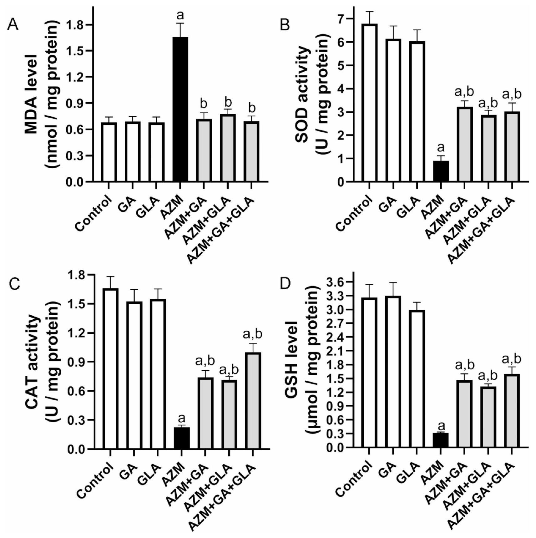 Fig. 5. Effect of GA, GLA, and their combination on the hepatic oxidative stress in AZM-treated rats. The oxidative markers include (A) MDA level, (B) SOD activity, (C) CAT activity, and (D) GSH level. The data is displayed as the mean ± SEM . We performed the ANOVA statistical analysis first, followed by Tukey’s post-hoc analysis. a P value indicates a significant difference from the control group, while indicates a significant difference from the AZM group.