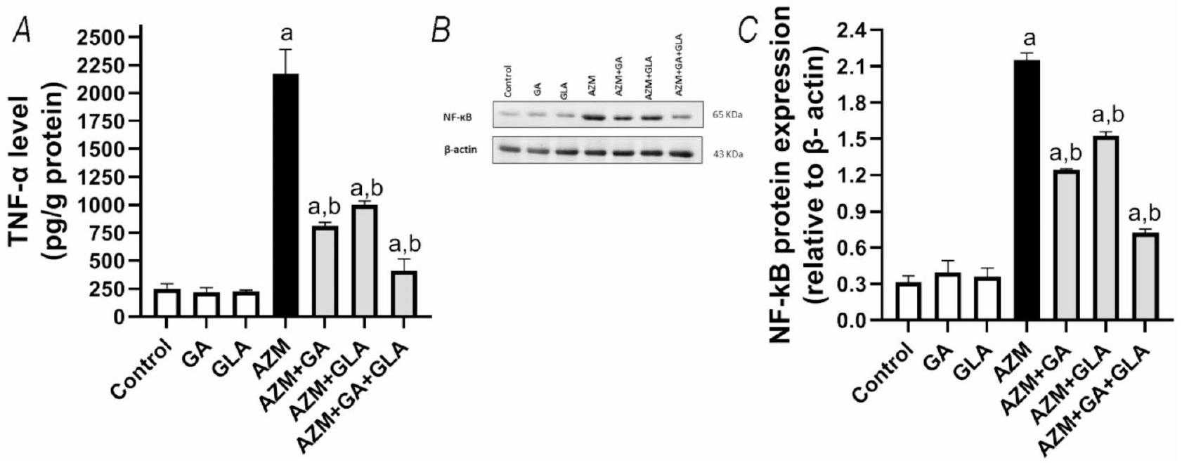 Fig. 6. Effect of GA, GLA and their combination on the hepatic inflammation in AZM-treated rats. (A) The expression level of TNF- in the liver was determined by ELISA. (B) The expression level of NF- kB and B-actin in the liver was determined by western blotting. B-actin was used as an internal control. Original blots are presented in supplementary figure S1 and S2 (C) Quantitative analysis of the Nf-kB protein. Data are presented as the mean ± SEM of three independent experiments, performed in triplicate. a Significantly different from the control at a p -value ; b Significantly different from AZM at a p -value .