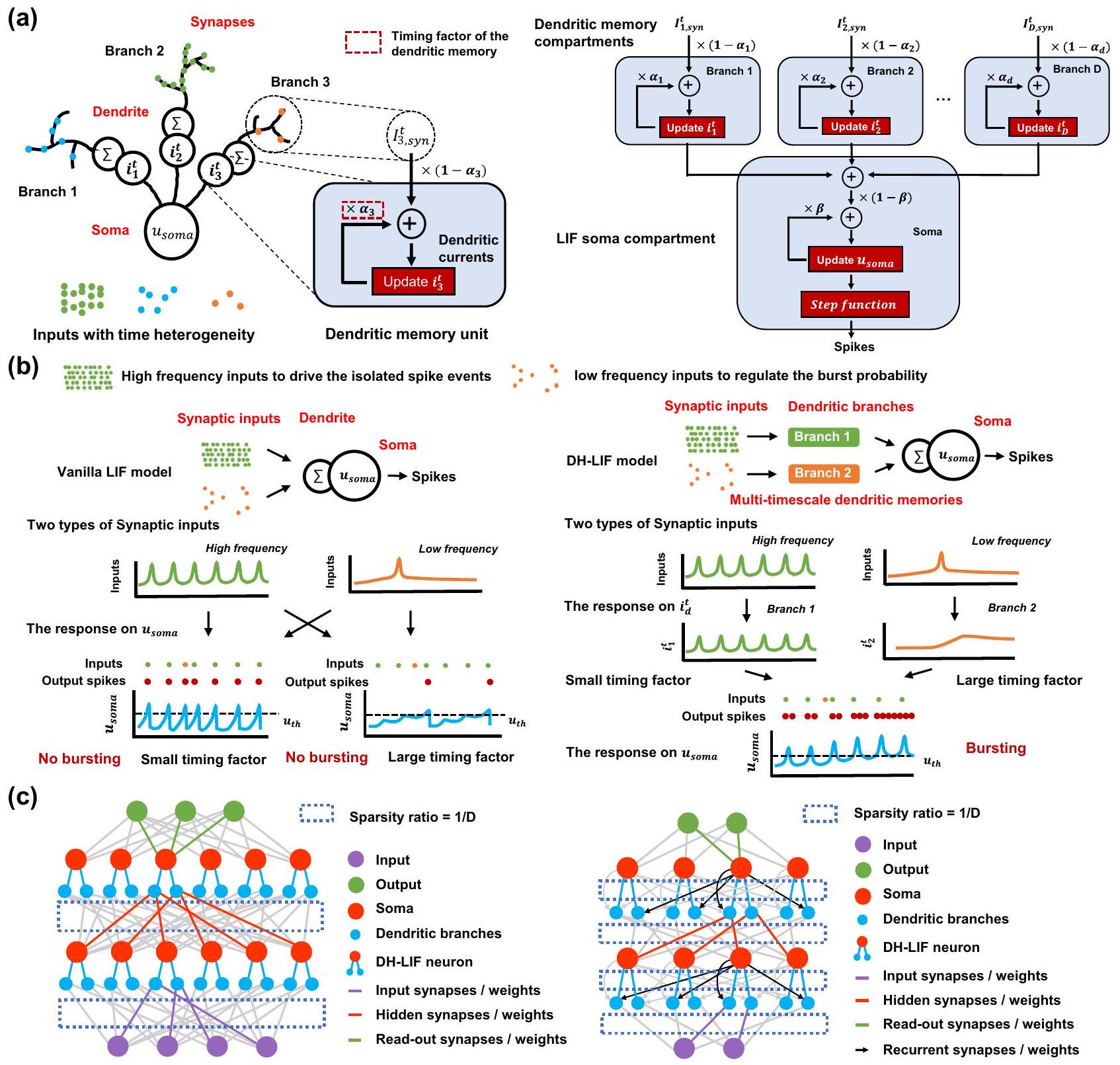بدون ذاكرة شجرية. يمكن لعامل التوقيت لجهد الغشاء أن يتطابق فقط مع مقياس الزمن لأحد المدخلين على الأكثر، على سبيل المثال، تطابق المدخل عالي التردد (عامل توقيت صغير) أو تطابق المدخل منخفض التردد (عامل توقيت كبير). عندما يتطابق العصبون فقط مع مقياس الزمن للمدخل عالي التردد، فإنه يفقد الذاكرة طويلة الأمد للمدخل منخفض التردد بسبب آلية التدهور السريع؛ وعندما يتطابق العصبون فقط مع المدخل منخفض التردد، فإنه لا يمكنه تتبع المدخل عالي التردد عن كثب بسبب الذاكرة الثقيلة للمعلومات التاريخية. وبالتالي، كما هو موضح في الشكل 2ب، لا يمكن لعصبون LIF العادي توليد نبضات متفجرة. على النقيض من ذلك، يمكننا تكوين عوامل توقيت متعددة ومرنة على فروع شجرية متعددة في عصبون DH-LIF، مما يجعله قادرًا على التعامل في الوقت نفسه مع مقاييس زمنية متغيرة لمداخل مختلفة، وتوليد النبضات المتفجرة بنجاح. في العمل السابق