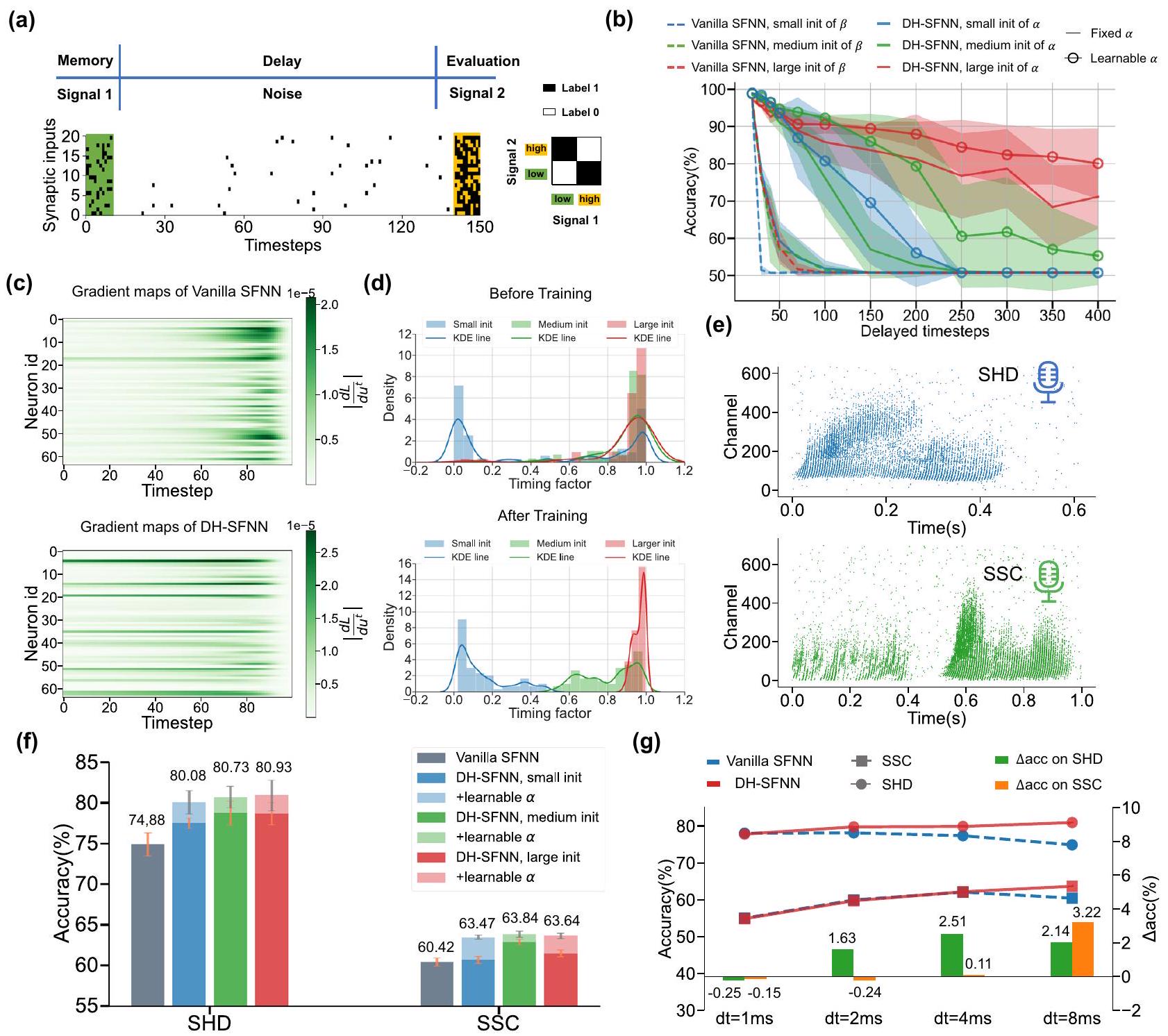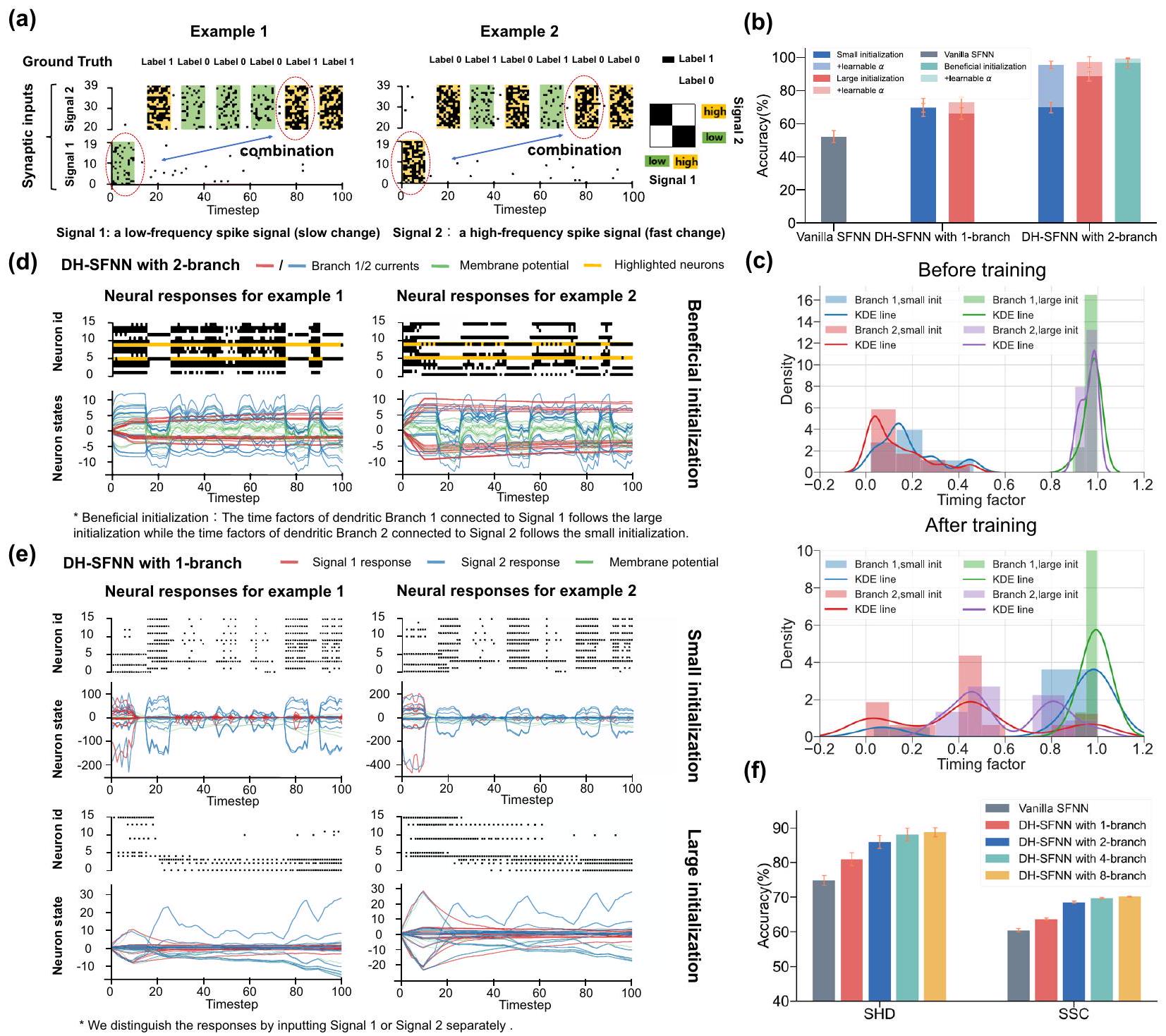 memory as evidenced by Fig. 3, they cannot process information with multiple timescales well. As the number of branches grows to two, DHSFNNs demonstrate much better performance owing to the temporal dendritic heterogeneity especially when the dendritic timing factors are initialized appropriately and learnable. Here the beneficial initialization means that we initialize large dendritic timing factors for Branch 1 in each DH-LIF neuron to enable long-term memory for lowfrequency Signal 1 while initializing small dendritic timing factors for Branch 2 to enable fast response for high-frequency Signal 2. Figure 4c visualizes the dendritic timing factors before and after training. As expected, the dendritic timing factors of Branch 1 with a small initialization tend to become larger while the dendritic timing factors of Branch 2 with a large initialization tend to become smaller, which evidences that the learning process makes the dendritic timing factors match the multiple timescales of input signals better. Notice that unless otherwise specified, the timing factors of membrane potentials are initialized following a medium distribution and are learnable in the experiments of Fig. 4.