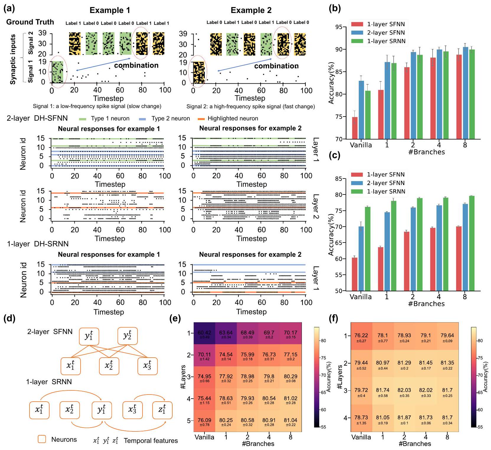 the capability of handling temporal heterogeneity with higher accuracy. Second, compared to one-layer SFNNs, two-layer SFNNs and onelayer SRNNs demonstrate much better performance owing to the interneuron integration of temporal features. Third, DH-SFNNs and DHSRNNs gradually produce higher accuracy as the number of dendritic branches grows. In short, these results evidence the improved capability of performing multi-timescale temporal computing tasks benefited from the temporal dendritic heterogeneity, and further reveal the synergistic working mechanism of the neuron-level and network-level feature integration.
