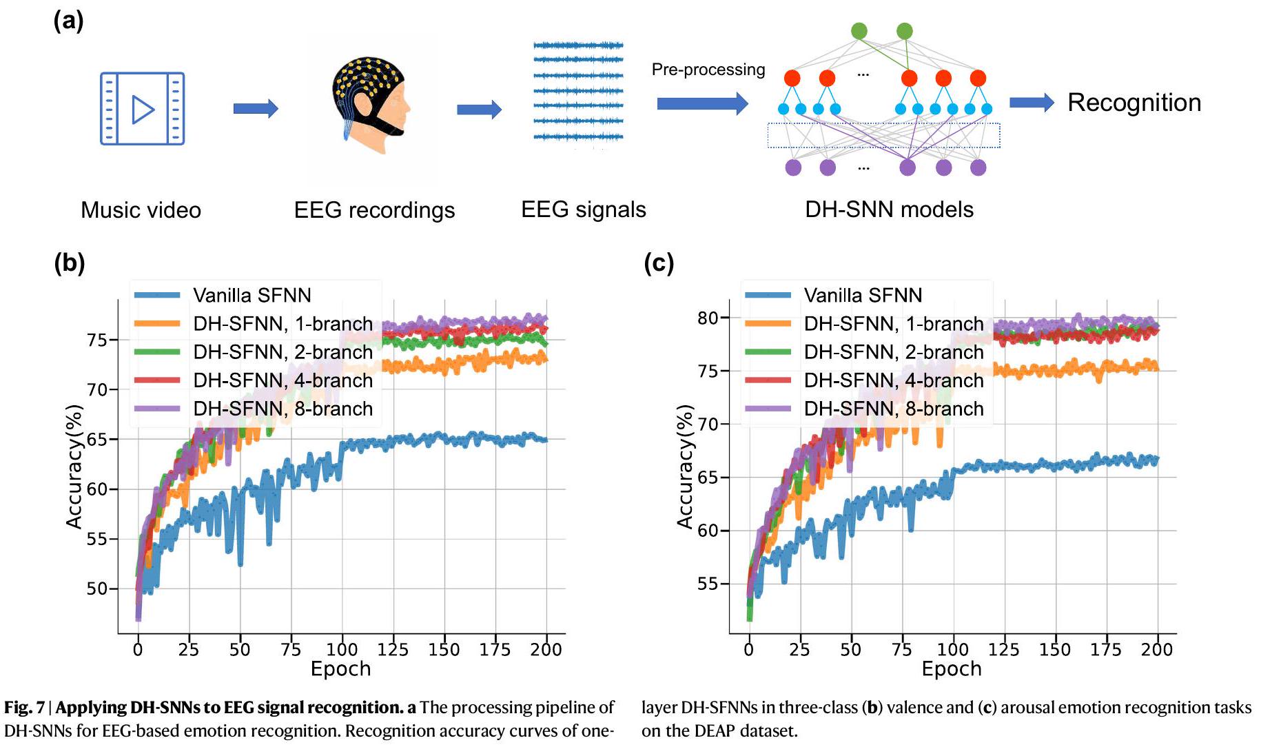 تنبؤ بأن الشبكات العصبية الديناميكية ذات الهيكل المتسلسل (DH-SNNs) لديها إمكانيات كبيرة في معالجة إشارات EEG متعددة الأوقات. كما هو ملخص في الجدول التكميلي S6، تظهر DH-SNNs مرة أخرى أفضل دقة في التعرف على مجموعة بيانات DEAP مع عدد أقل بكثير من المعلمات مقارنة بالأساليب الحالية بما في ذلك الشبكة العصبية متعددة الطبقات (MLP).