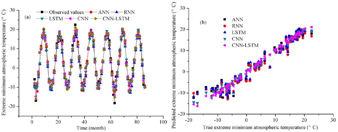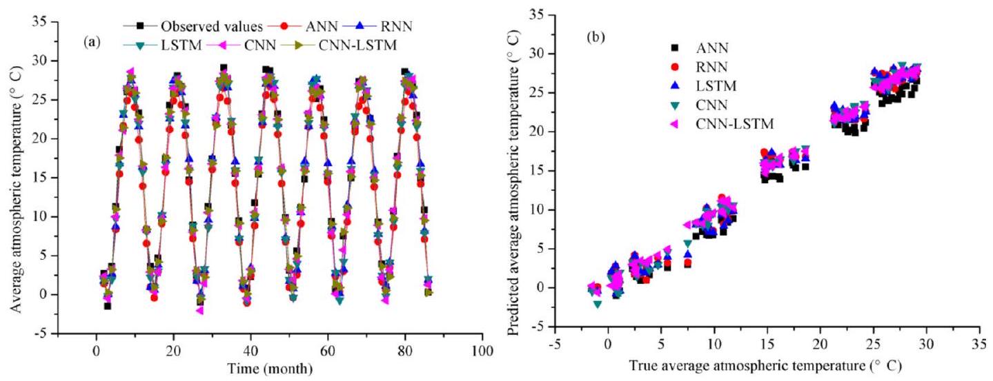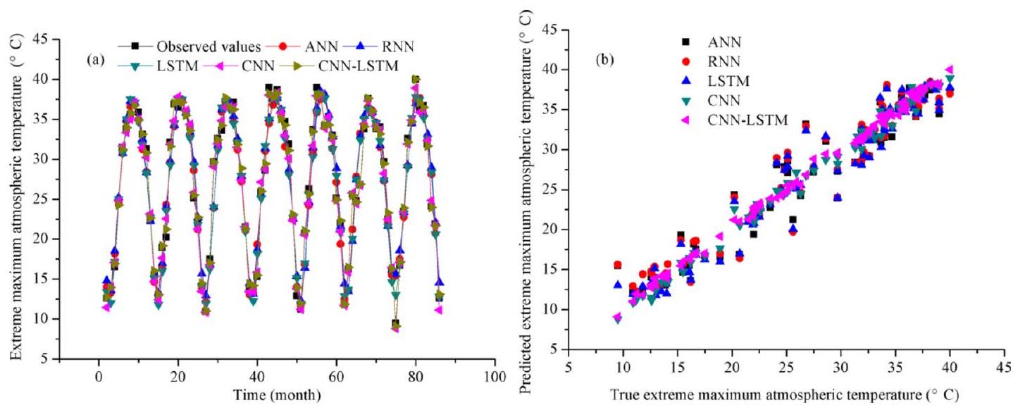 (3) In climate change monitoring, extreme climate is of extraordinary importance, and the CNN-LSTM model also has higher efficiency than other four models in extreme climate prediction. The surveys show that predicted extreme air temperature is more accurate than predicted precipitation. The CNN model is close to CNN-LSTM model in some single coefficients but the errors demonstrate that the CNN-LSTM has more stable performance. The CNN-LSTM can reasonably predict the magnitude and monthly variations in climate elements, capture the peaks of the climate data, and meet the evaluation criteria of model performance. The CNN-LSTM is a promising approach for climate simulation.