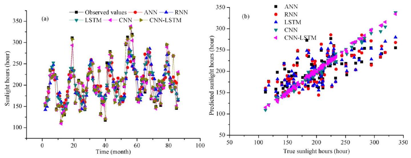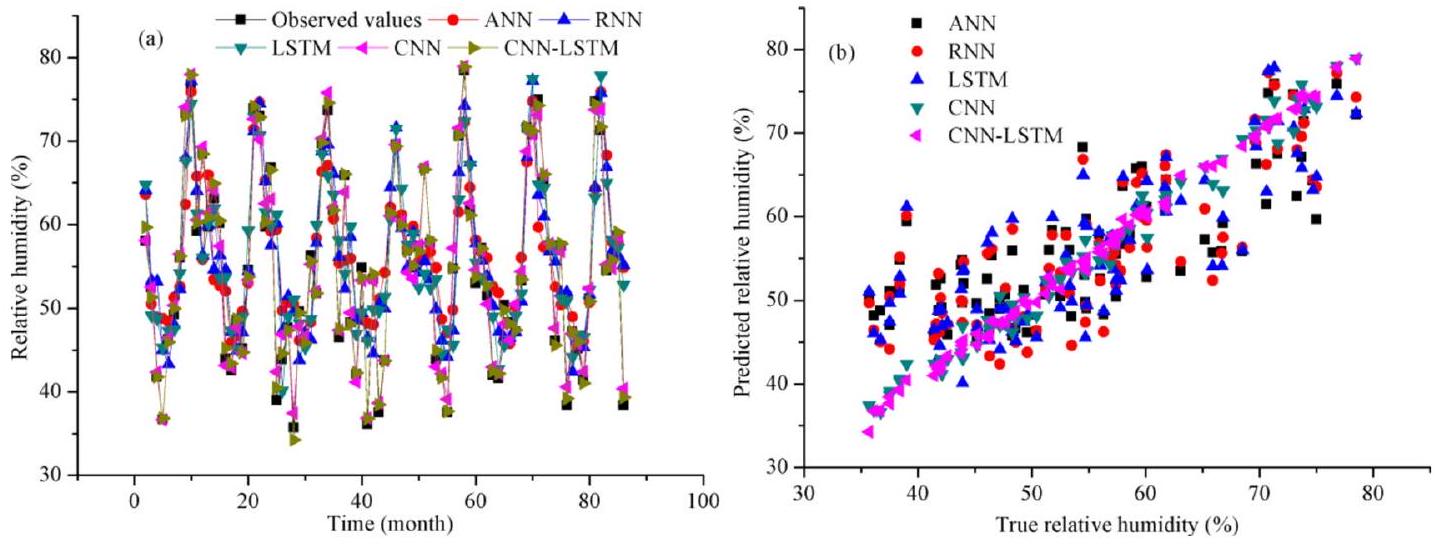 (2) The CNN-LSTM is compared with ANN, RNN, LSTM, and CNN utilizing the same monthly climate data. The input variables lag times are derived from the cycle of monthly climate data. The performance achieved by the CNN-LSTM model is greater than other compared artificial intelligence models (ANN, RNN, LSTM, CNN). The prediction results of CNN-LSTM model is superior to other models in generalization ability and precision. This indicates the effectiveness of the proposed CNN-LSTM model over other existing artificial intelligence models. This means that compared to other models, the CNN-LSTM has the lowest RMSE and MAE values and the highest R value.