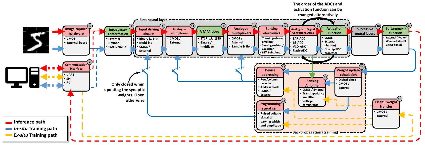خلال التدريب خارج الموقع بواسطة الأسهم/الخطوط الصفراء. لكل صندوق، تشير الجزء العلوي (المُلوّن) إلى اسم الوظيفة التي يجب تحقيقها بواسطة الكتلة الدائرية، والجزء السفلي يشير إلى نوع الأجهزة المطلوبة. يشمل الصندوق المعنون بالطبقات العصبية المتعاقبة عدة كتل فرعية بهيكل مشابه للمجموعة المعنونة بالطبقة العصبية الأولى. 1S1R تعني 1 محدد 1 مقاوم بينما 1R تعني 1 مقاوم. UART وSPI و