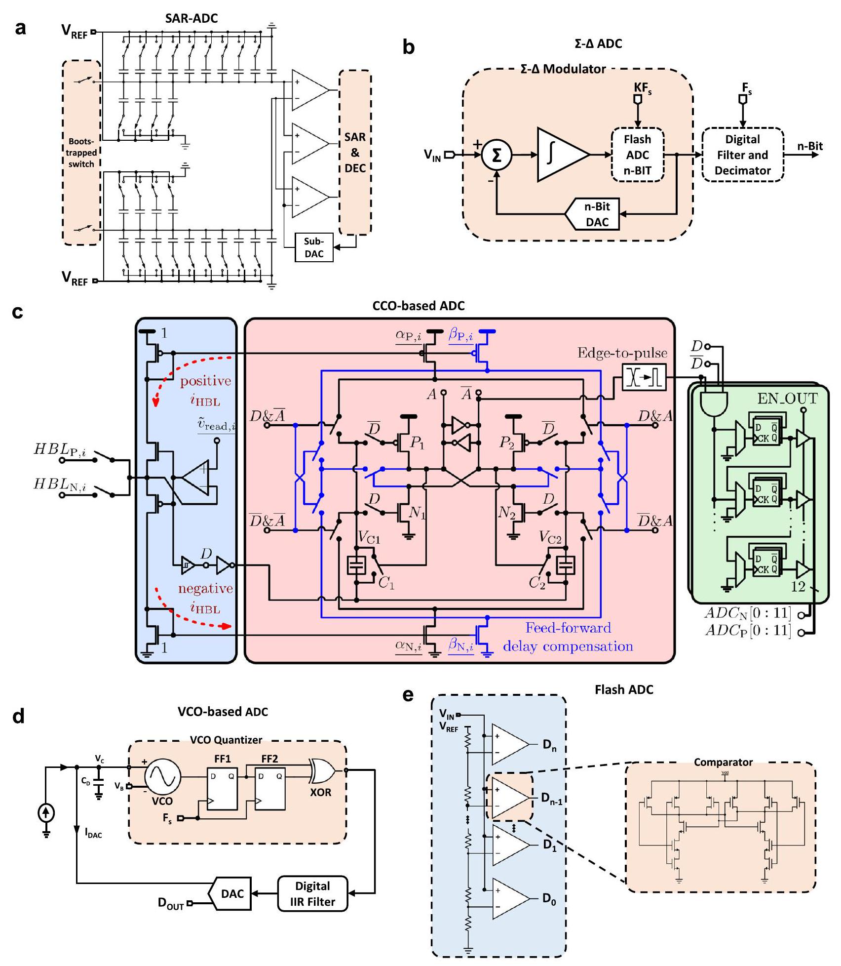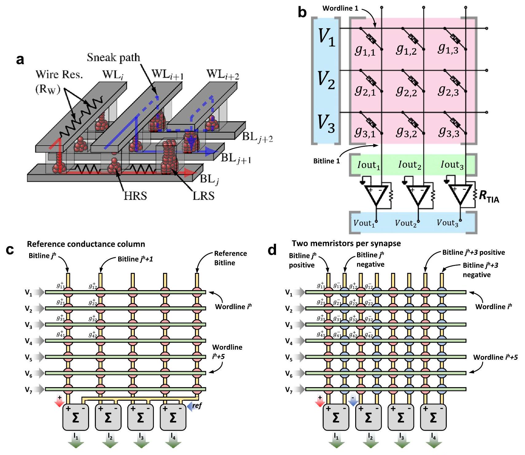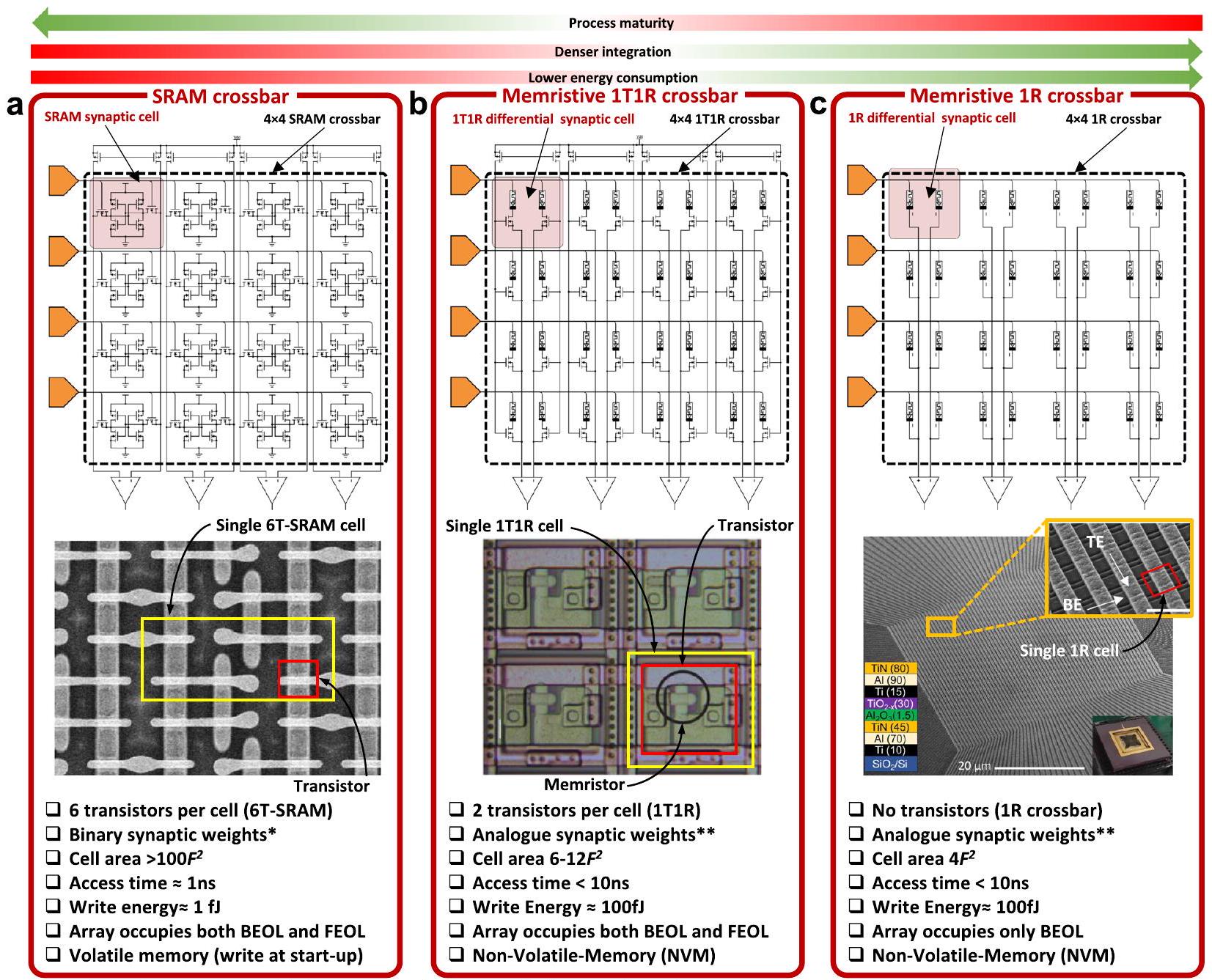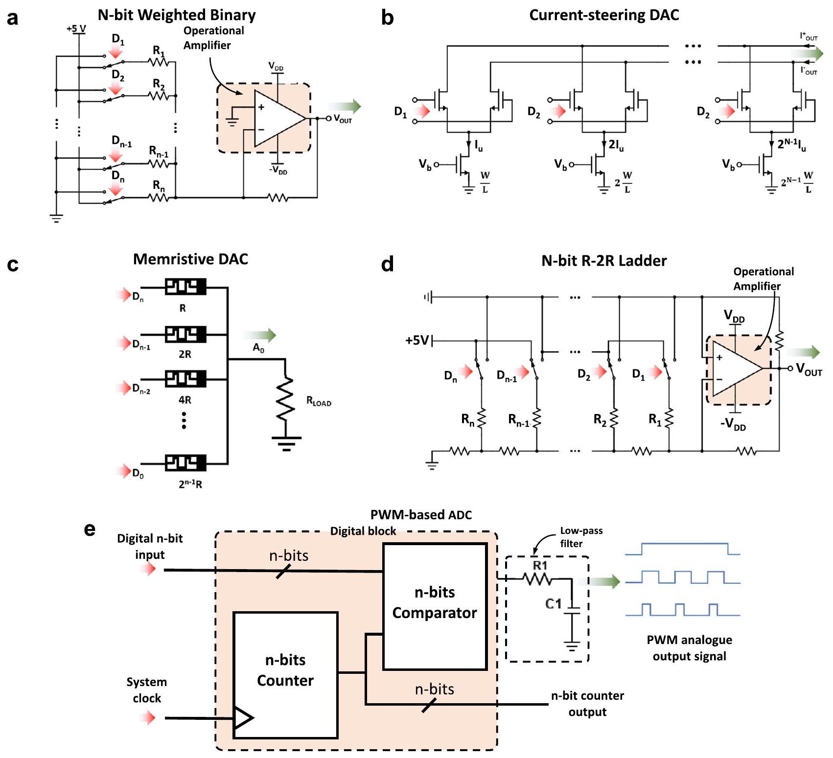 ميمريستور (1 R أو 1 M) أو مصفوفة تشابكية سلبية (الشكل 3c). عند استخدام مصفوفات تشابكية من الميمريستورات لأداء عمليات VMM، قد تكون هناك حاجة إلى دوائر إضافية عند الإدخال والإخراج لاستشعار و/أو تحويل الإشارات الكهربائية (انظر الصناديق الحمراء في الشكل 2). من أمثلة هذه الدوائر محولات من الرقمية إلى التناظرية (DAC)، ومن التناظرية إلى الرقمية (ADC) ومضخمات مقاومة التيار (TIA). لاحظ أن دراسات أخرى استخدمت تنفيذات تختلف قليلاً عن هذا المخطط، أي، دمج أو تجنب كتل معينة لتوفير المساحة و/أو تقليل استهلاك الطاقة (انظر الجدول 1).
