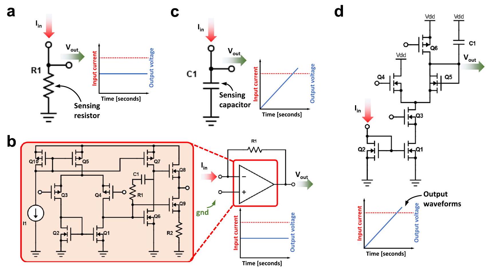 تحت نظام النانو أمبير، تعتبر تكامل الشحنة الخيار الأكثر ملاءمة لتحويل التيار إلى جهد. يمكن تحقيق ذلك باستخدام مكثف. وبالتالي، فإن القياس ليس فوريًا حيث يتطلب وقت تكامل ثابت وقابل للتحكم قبل القياس. لتقليل متطلبات المساحة لمكثف التكامل، يسمح استخدام مقسم التيار بتقليل التيار بشكل أكبر، ومعه، حجم المكثف المطلوب. التبادل في هذه الحالة هو مع الدقة (بشكل رئيسي بسبب عدم تطابق الترانزستورات) ونطاق جهد الخرج الديناميكي.