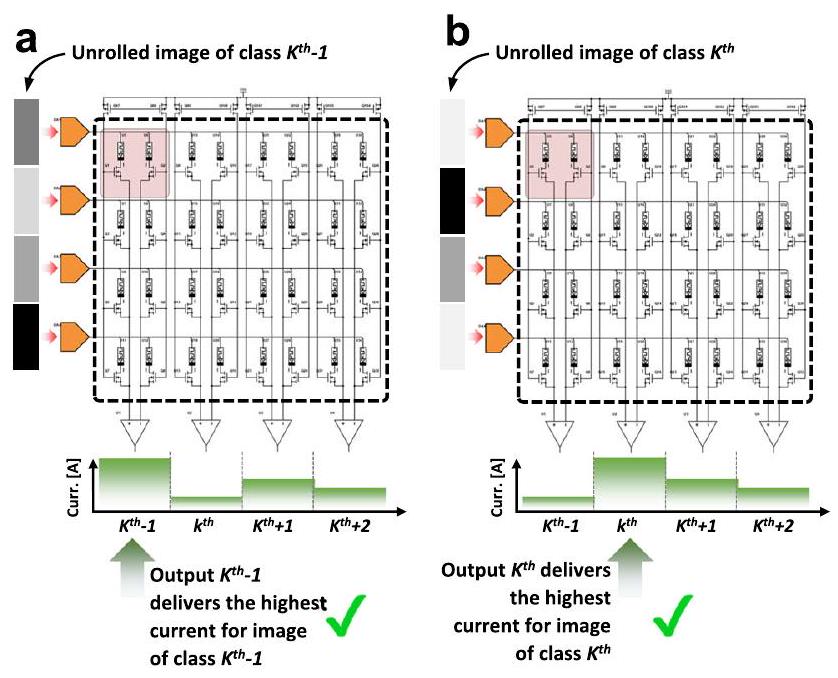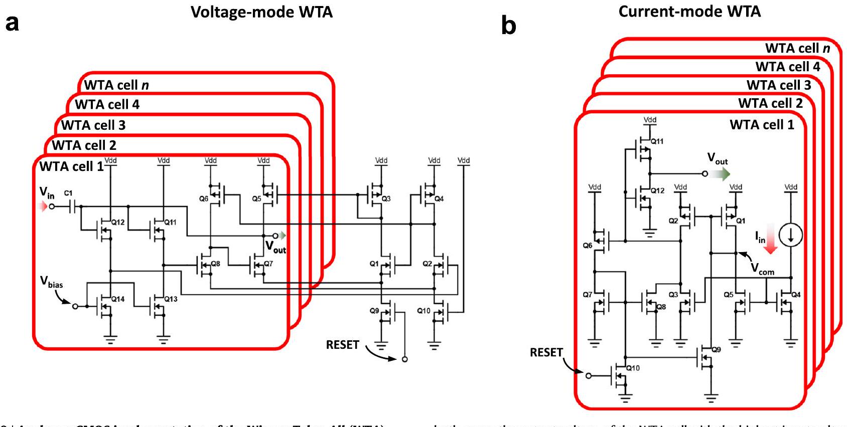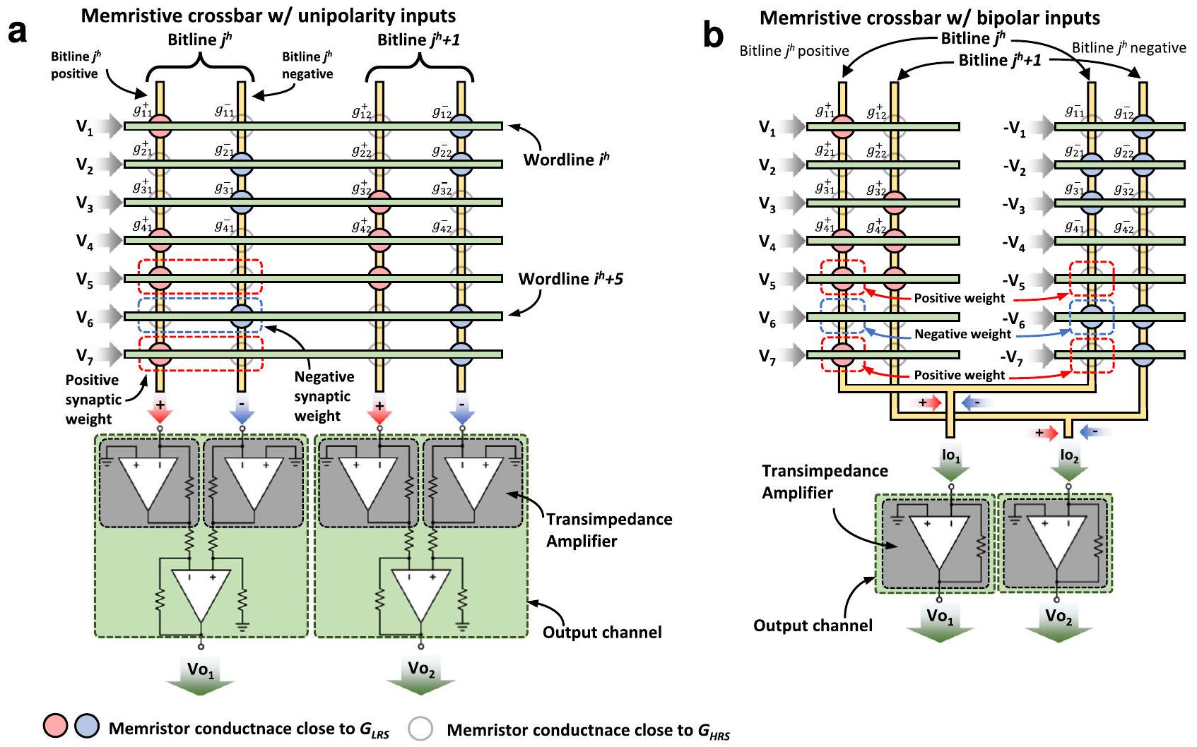 المخرجات، مضخمة. يجب أن يُلاحظ أنه على الرغم من عدم الضرورة في حالة الشبكات العصبية المنفذة في مجال البرمجيات، في حالة الشبكات العصبية المعتمدة على نوى الميمريستور-VMM، يجب أن تكون عناصر متجهات الإدخال لكل طبقة عصبية ضمن نطاق من الفولتية التناظرية. لهذا السبب، فإن دوال تفعيل ReLU، التي هي بطبيعتها دوال تفعيل غير محدودة.