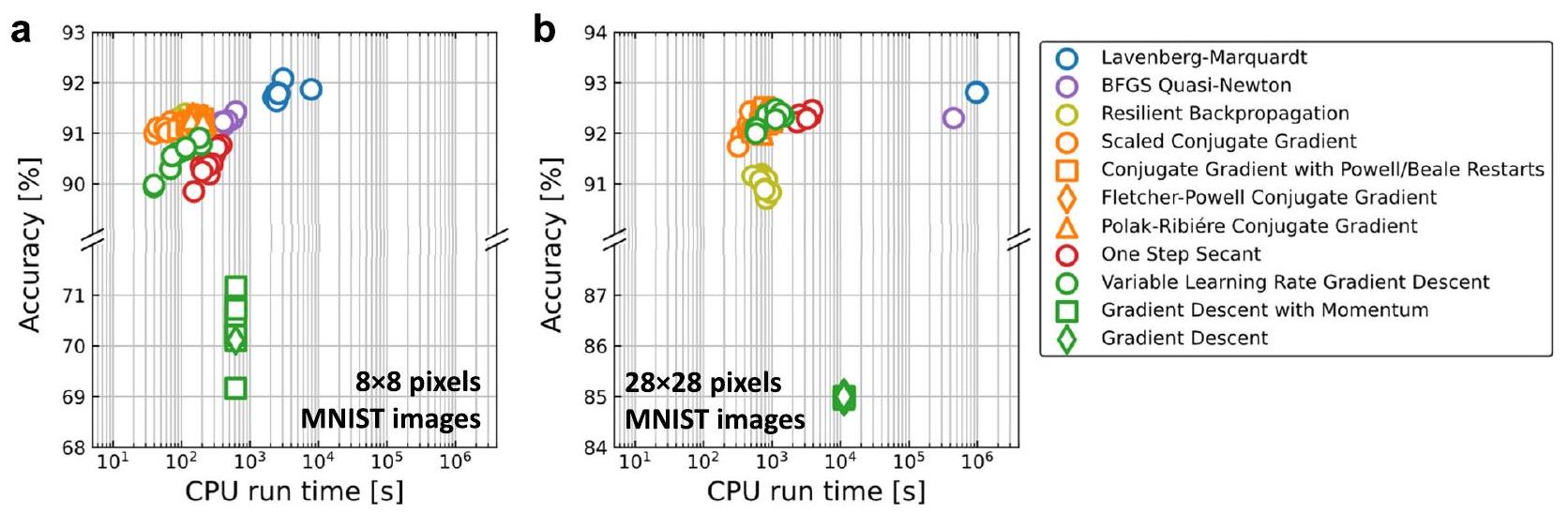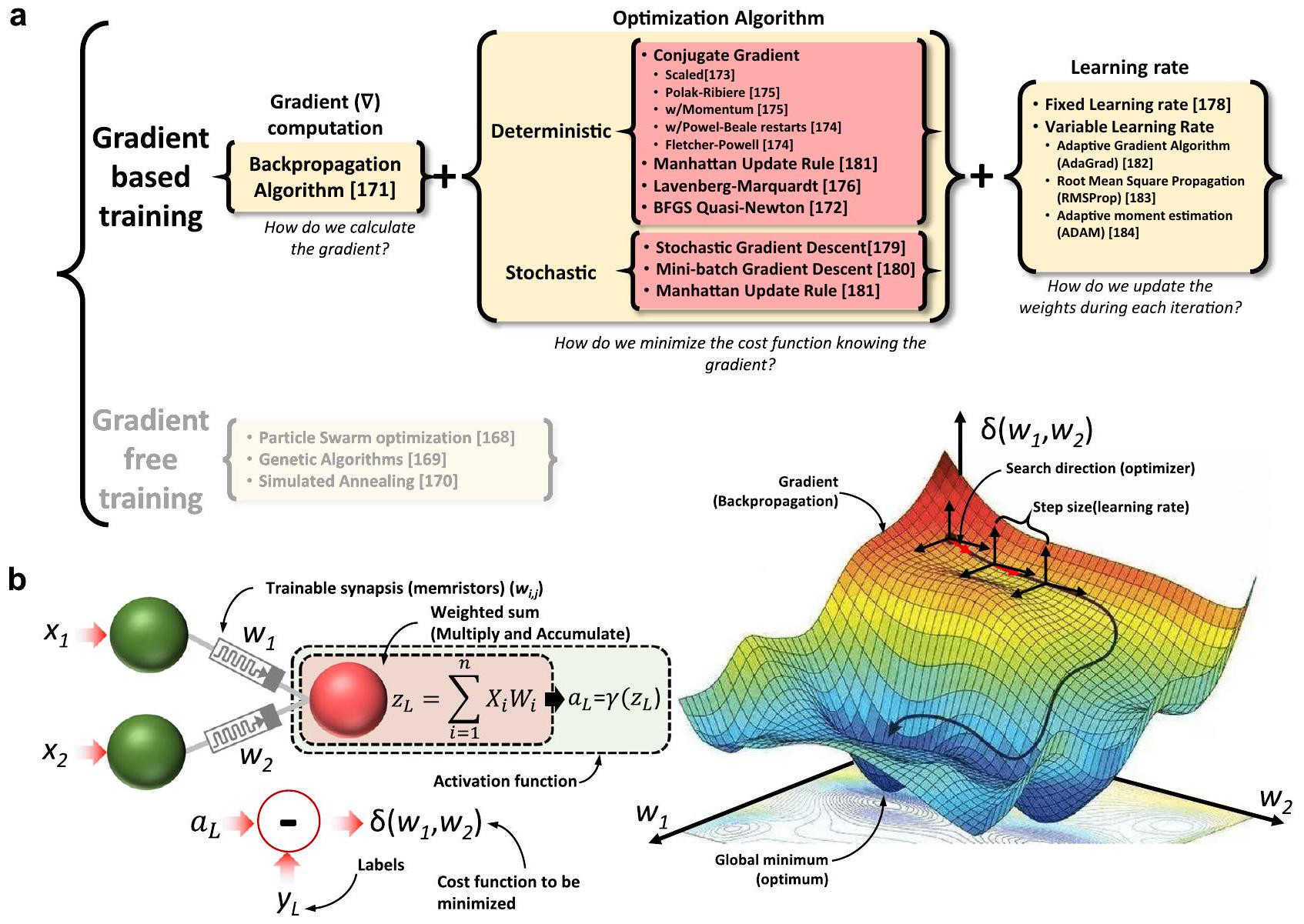 يجب ضبط أوزان المشابك إلى قيم تقلل من دالة الخسارة. لتحقيق هذا الهدف، يمكن استخدام عائلتين من الخوارزميات: الخوارزميات التي لا تعتمد على التدرج والخوارزميات المعتمدة على التدرج (كما هو موضح في الشكل 12أ). تشمل الطرق التي لا تعتمد على التدرج مثل تحسين سرب الجسيمات