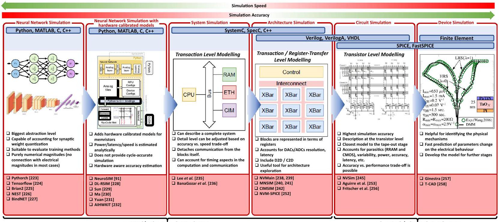 communication between them. The selection of the most suitable simulation technique depends thereby in the requirements of the specific design stage: the closer it gets to the tape-out, higher accuracy in the simulation is required (achievable with circuit level simulations), instead, for the early design stages, system-level modelling is enough to get a quick estimation of the achievable performance in large, complex ANNs. In any case, properly combining this many different simulation tools will ultimately lead to the optimization and further development of the memristive ANNs.