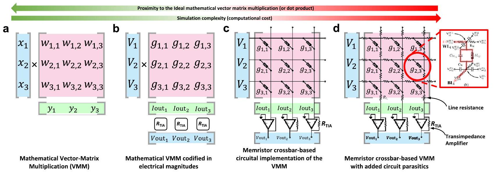 and the interline capacitances (see the inset showing a circuit schematic of a memristive cell in a CPA structure considering the associated wire parasitic resistance and capacitance). Aspects such as device variability are captured by the memristor model employed.